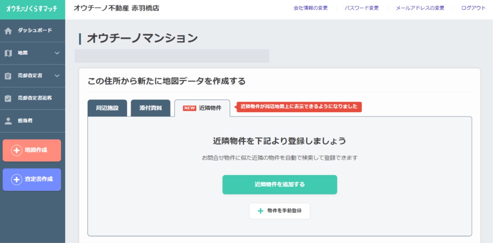 2. 「近隣物件」のタブをクリックし、近隣の物件情報や土地情報を手動で新規登録したり、既にオウチーノサイトに登録されている情報を選択します。