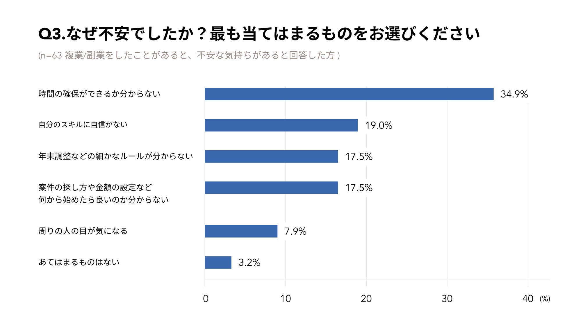 複業をはじめるときに、何が不安となり足かせとなっているのでしょうか。複業/副業経験者の中で、複業を始めるときに不安があったと回答した方に「なぜ不安でしたか?」と質問したところ、上記のような回答となりました。「時間の確保ができるか分からない」という回答が3割を超えていることから、複業する時間をどのようなスケジュールで行えばよいのか分からない人が多い傾向にあることがうかがえます。