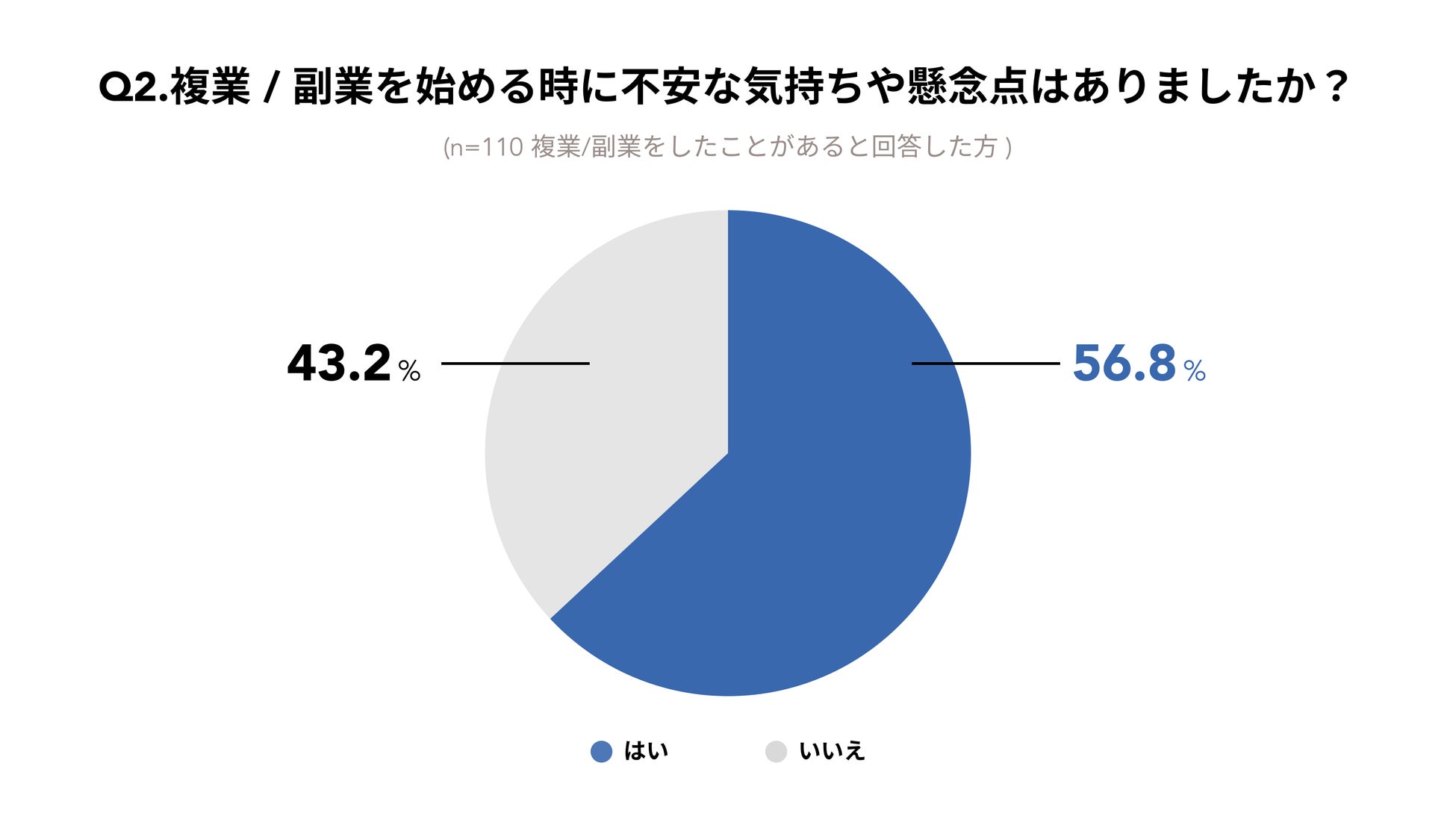 複業経験者に対して、始めるときに不安な気持ちや懸念点はあったかと質問したところ、約6割の人が「はい」と回答しました。複業を始めるときに不安な気持ちがある方が多いことから、それが複業をまだ始めていない人にとっての理由にもあたるのではないかと考えます。