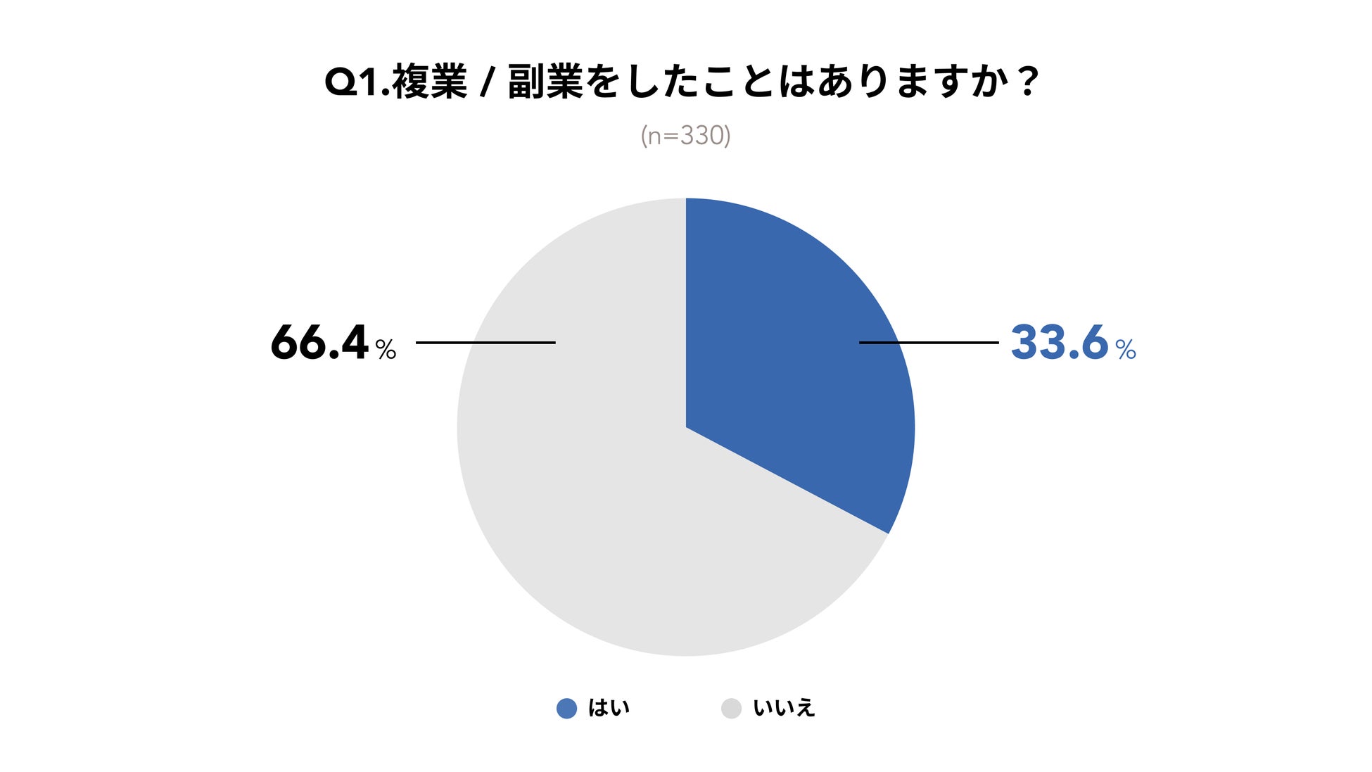 まず、複業/副業の経験の有無について調査しました。「複業/副業をしたことがある」と回答したのは33.6%、「複業/副業をしたことがない」と回答したのは66.4%となりました。この結果から、前提としてまだまだ複業をしたことが無い方が多いということが読み取れます。