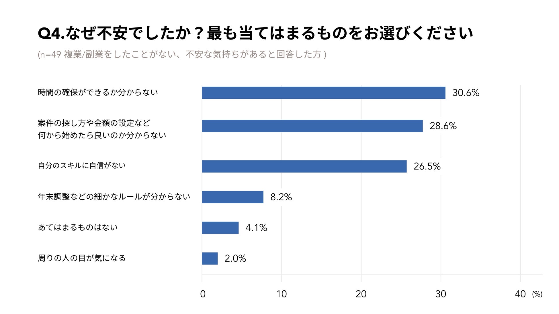 また、複業経験のない方の中で、始めることに不安があると感じている人に対して、なぜ不安だったか質問したところ、上記のような回答となりました。「自分のスキルに自信がない」「何から始めたらよいか分からない」と回答した人も3割近くいることから、複業を始めようにも自分のスキルを棚卸しできていない方や、はじめ方に困っている方が多い傾向がうかがえます。