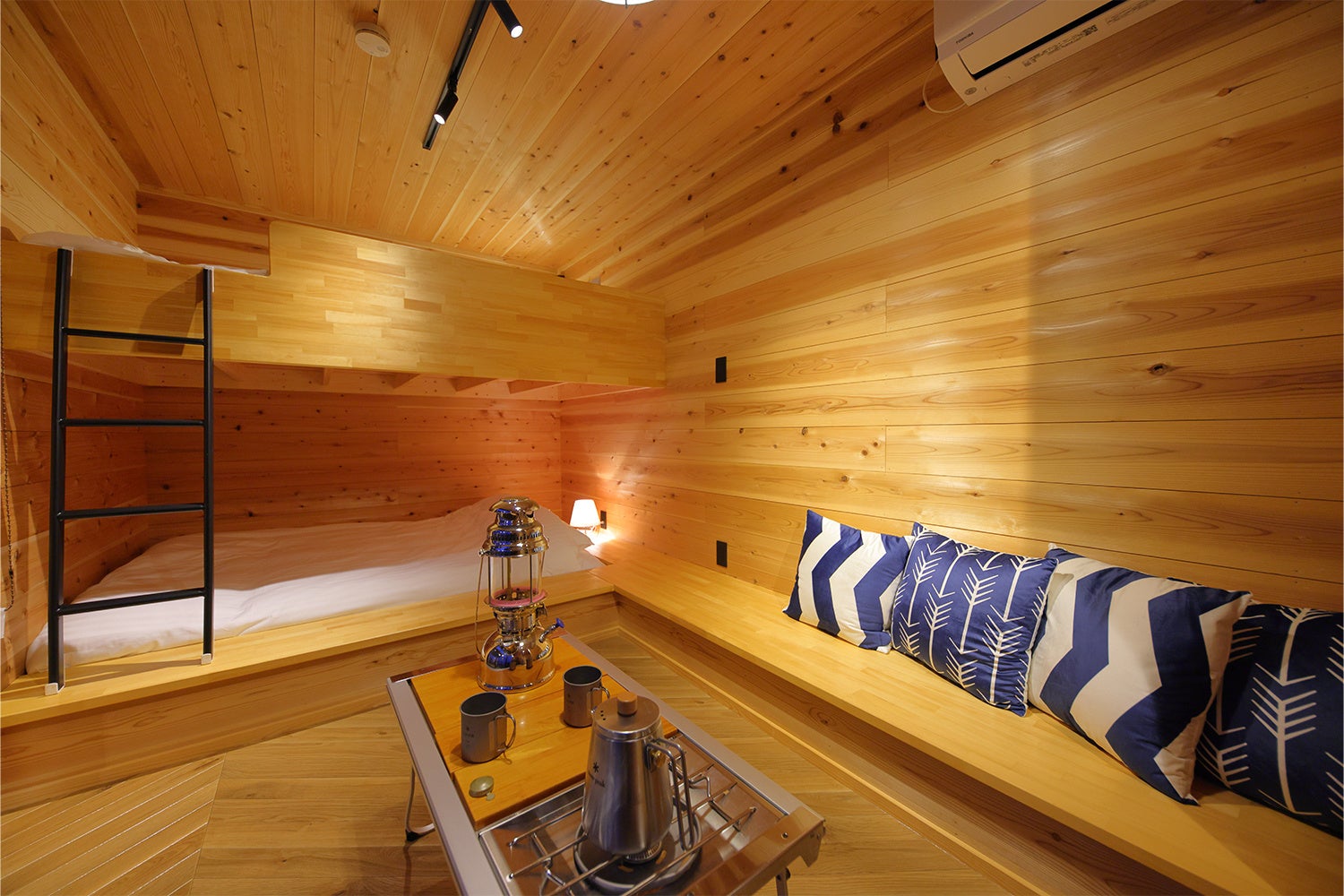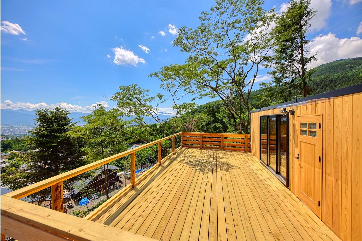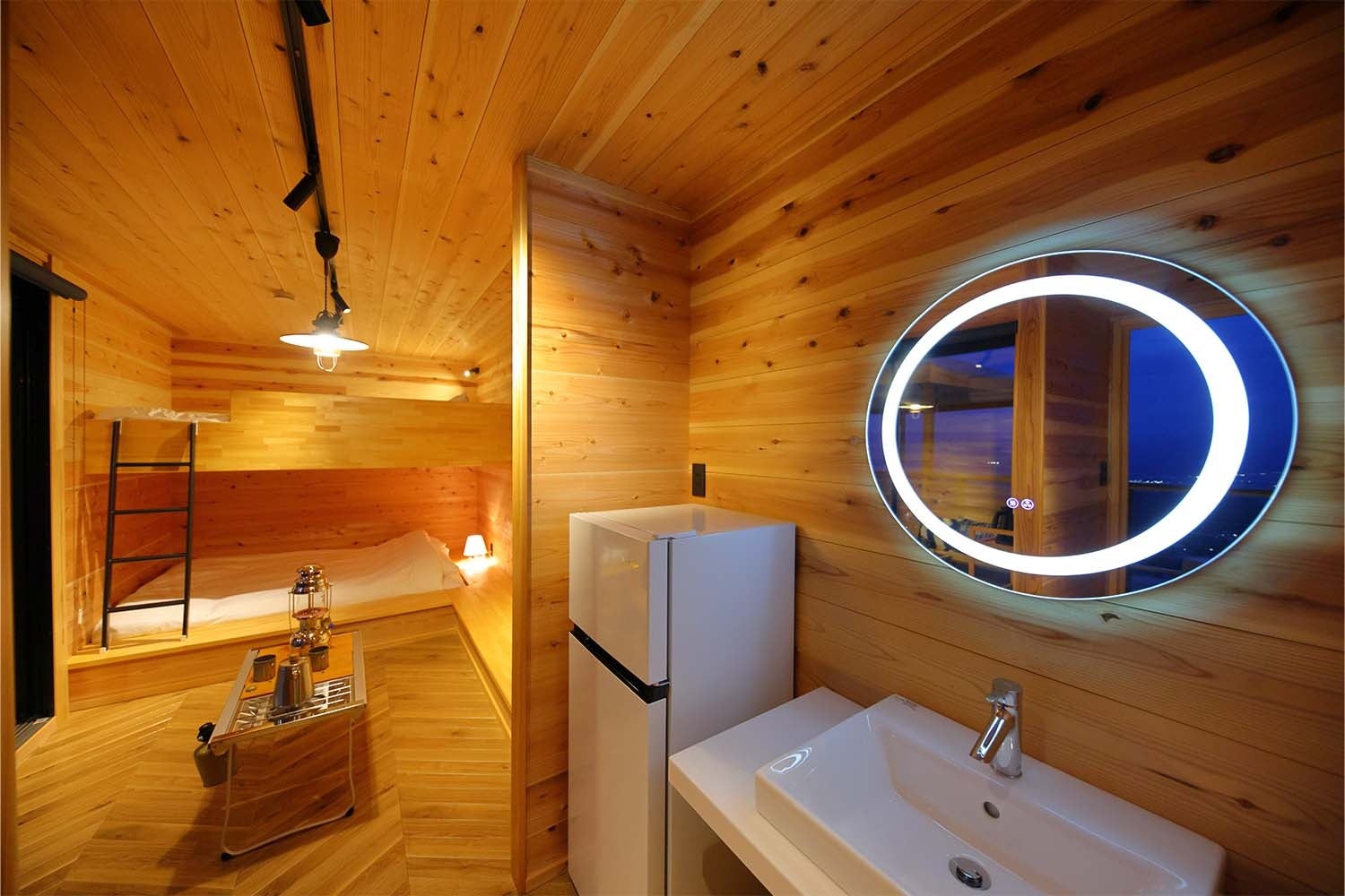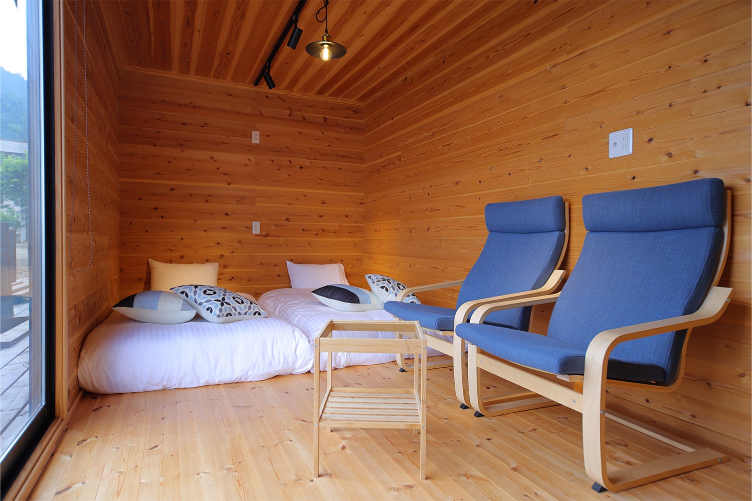 宿泊棟には、ログハウスなど自然素材を用いた住空間を手掛ける地元企業が施工したこだわりのタイニーハウスをご用意。全10棟、3タイプのお部屋はいずれも国産杉をふんだんに使用。暖かい⽊のぬくもりとほのかな⾹りに包まれる心安らぐひとときを満喫していただけます。もちろんお部屋から望む景⾊は息をのむ絶景。野鳥の鳴き声や木漏れ日。自然を身近に感じる専⽤デッキも完備。充実した設備の客室で特別なひとときをお過ごしください。