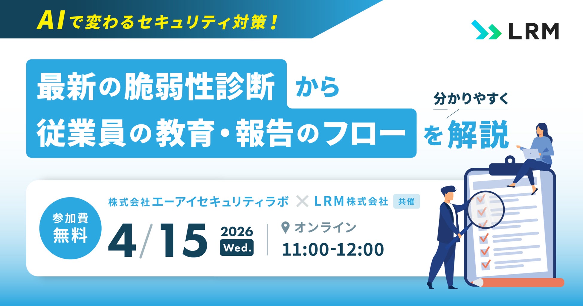 LRM株式会社(本社:兵庫県神戸市、代表取締役CEO:幸松哲也)と株式会社エーアイセキュリティラボ(本社:東京都千代田区、代表取締役社長:青木 歩)は、2026年4月15日(水) 11時から、「AIで変わるセキュリティ対策!最新の脆弱性診断から従業員の教育・報告フローを分かりやすく解説」をテーマとしたセミナーをオンライン無料開催いたします。