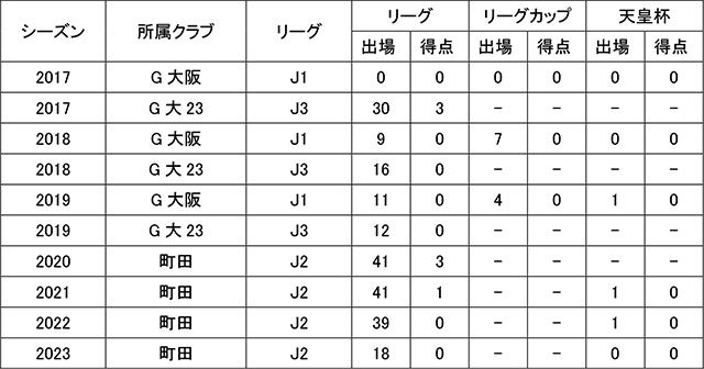 所属歴/ソレッソ熊本 – 熊本ユナイテッドSC U-12 – ロアッソ熊本Jrユース – 東福岡高等学校 – ガンバ大阪 – FC町田ゼルビア – ガンバ大阪 – FC町田ゼルビア