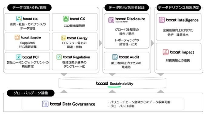 *2 サステナビリティERP(booost Sustainability」は、自社およびサプライヤーのサステナビリティ関連財務情報を管理する“統合型SXプラットフォーム”です。国際開示基準に準拠した環境、社会、ガバナンス等の1,200以上のデータポイントに対応したサステナビリティ関連情報の収集、集計を自動化し、リアルタイムでのモニタリングを可能にします。グローバルに対応したデータガバナンス機能を搭載しており、グループやサプライチェーンを含む組織において多階層の承認フローの実装が可能であるほか、第三者保証等にも対応すべく設計したプラットフォームであり、サステナビリティ関連情報の開示に向けて発生する各業務を効率化・最適化する機能をフェーズ毎に包括的に提供しています。提供開始以降、計95カ国以上、約6,500社197,000拠点以上(2025年12月時点)に導入されています。