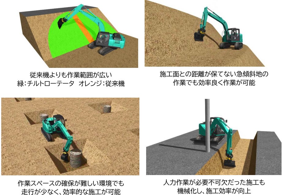 ※1 チルトローテータのアタッチメント本体はengcon社製。チルトローテータはバックホーなどの建設機械に取り付けるアタッチメントで、バケットが左右に45度傾く「チルト」の機能、360度回転する「ローテート」の機能をもつ