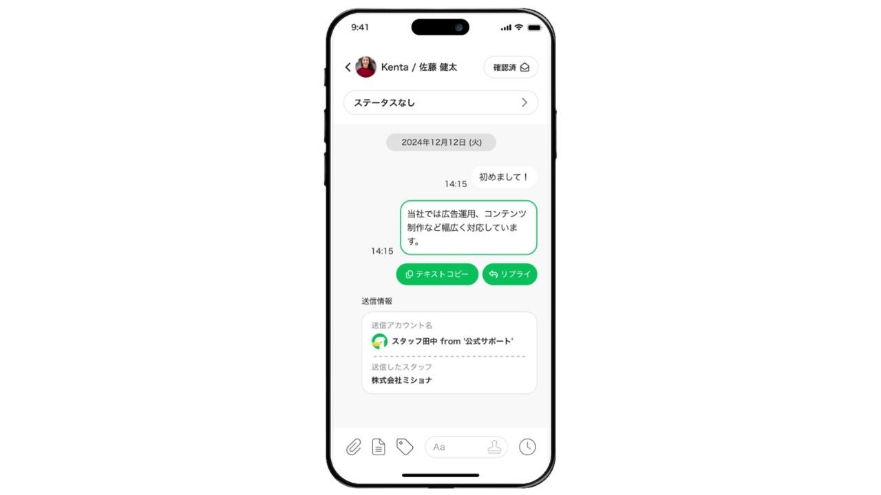 株式会社ミショナ提供のLINE公式アカウント拡張ツール「L Message(エルメッセージ)」は、スマホアプリでも利用可能。外出中でもトーク内容や対応状況を確認したり、メッセージを送信したりできます。