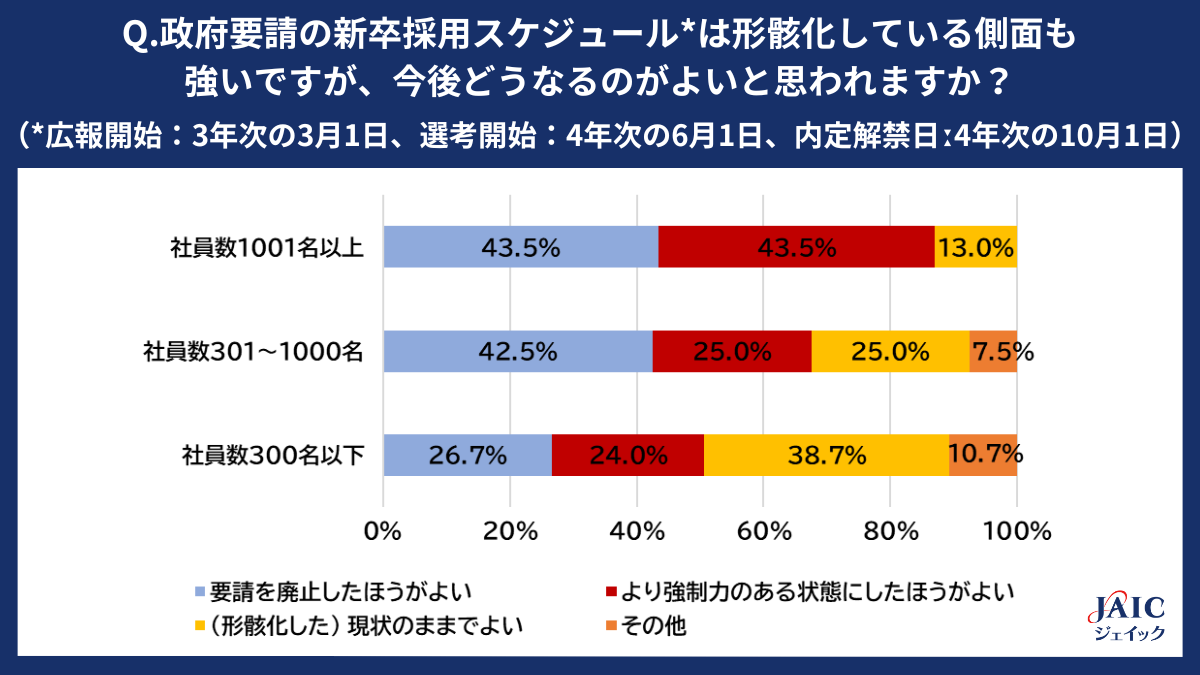 また『社員数300名以下』の企業では、『(形骸化した)現状のままでよい』の回答が多い傾向が伺えました。その理由として、中小企業は採用にかけられる人件費や採用費が限られるため、要請の廃止による一層の早期化や、それに伴う採用活動の長期化・負担増加を懸念していることが考えられます。