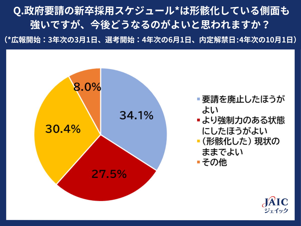 企業の人事担当者に「政府要請の新卒採用スケジュール(※)は形骸化している側面も強いですが、今後どうなるのがよいと思われますか?」と質問したところ、「要請を廃止したほうがよい」が34.1%、「より強制力のある状態にしたほうがよい」が27.5%、「(形骸化した)現状のままでよい」が30.4%、「その他」が8.0%となり、現行の政府要請のスケジュールに変更を求める回答が合わせて61.6%と、半数以上となりました。