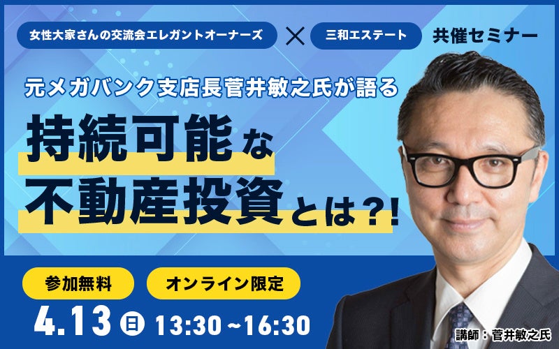 不動産資産管理会社の三和エステート株式会社(本社:福岡市博多区博多駅南、代表取締役社⻑:⽯井 清悟)は、2025年4月13日(日)に元メガバンク支店長 菅井 敏之氏をゲスト講師にお迎えした無料共催オンラインセミナー『持続可能な不動産投資とは?!』を開催します。