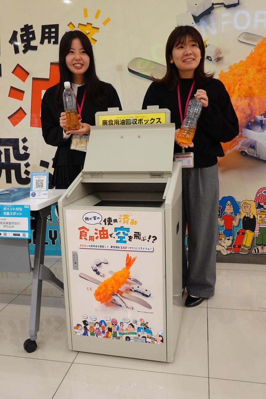 また、2024年11月22日には本取り組みの開始を記念し、イオンモール堺鉄砲町にて家庭系廃食用油の回収開始イベントを実施しました。本イベントでは、家庭系廃食用油の回収に加え、廃食用油からSAFが製造・使用されるまでのVR体験コーナー、そらやん(関西エアポートグループ公式キャラクター)の塗り絵体験コーナーを設け、廃食用油の資源化についてお客さまに広く理解いただく機会となりました。
