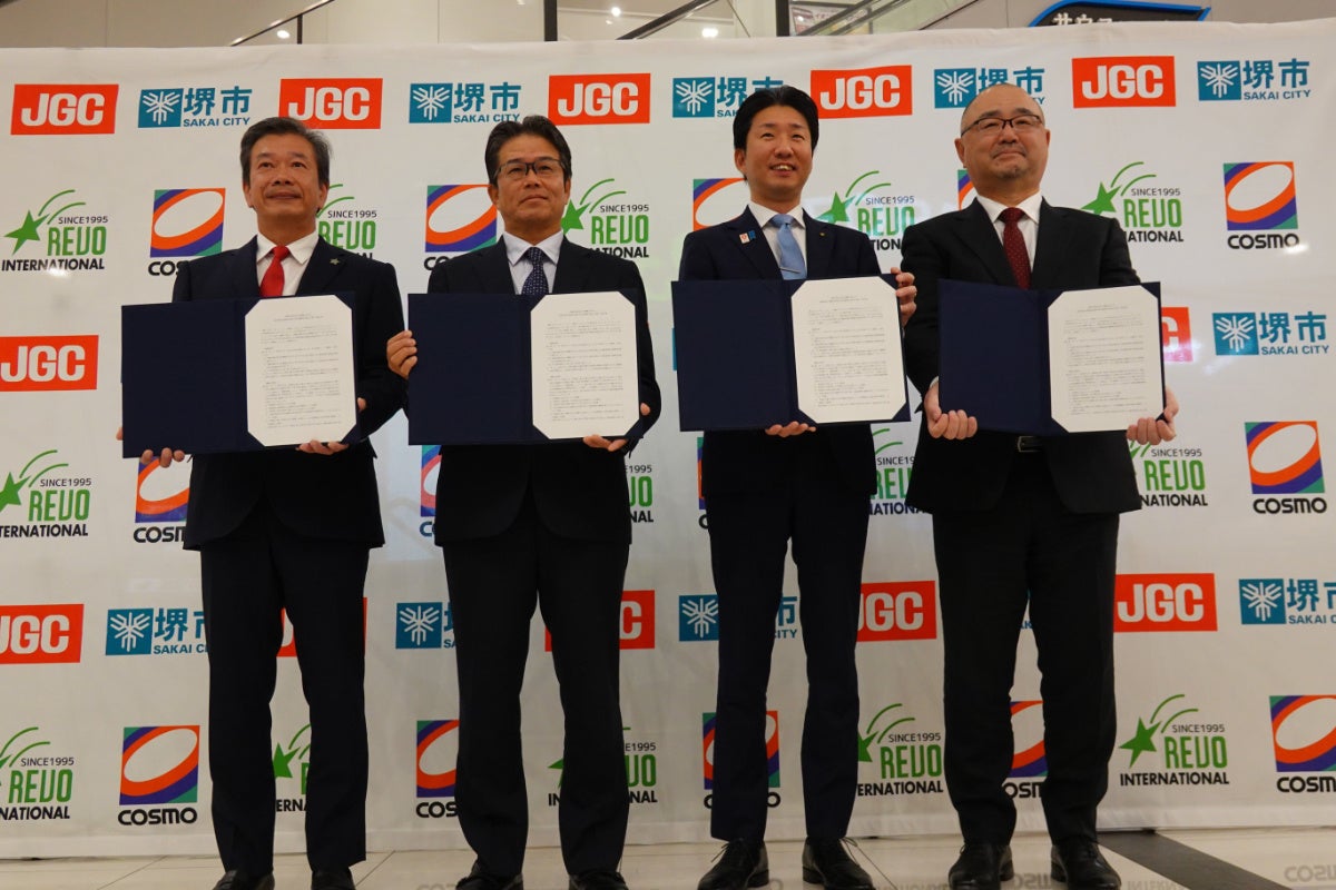 日揮ホールディングス株式会社(代表取締役会長CEO:佐藤 雅之、以下「日揮HD」)、コスモ石油株式会社(代表取締役社長:鈴木 康公、以下「コスモ石油」)、株式会社レボインターナショナル(代表取締役CEO:越川 哲也、以下「レボインターナショナル」)は、堺市(市長:永藤 英機)と持続可能な航空燃料SAF(Sustainable Aviation Fuel、以下「SAF」)及びバイオプラスチックなどの原料となる使用済み食用油(以下「廃食用油」)の資源化促進を図るため、「持続可能な社会の構築に向けた廃食用油の資源化促進に係る連携及び協力に関する協定書」を2024年11月22日に締結し、同日に堺市内のイオンモール堺鉄砲町で協定締結式を執り行いました。