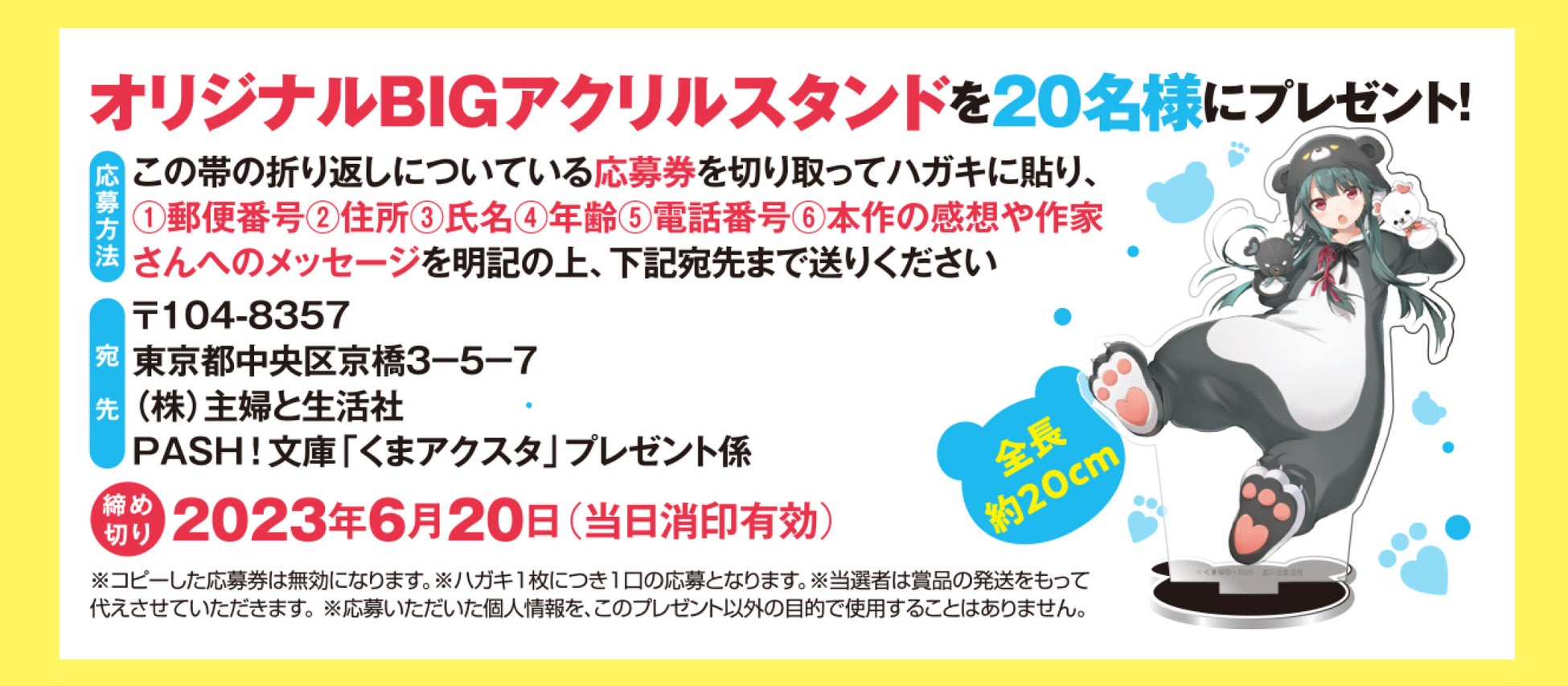 PASH! 文庫創刊を記念して、文庫の帯についている応募券を集めて非売品のオリジナルグッズなどが当たる応募型キャンペーンを実施中!文庫『くまクマ熊ベアー』では、帯についている応募券でオリジナルBIGアクリルスタンドを抽選で20名にプレゼント。