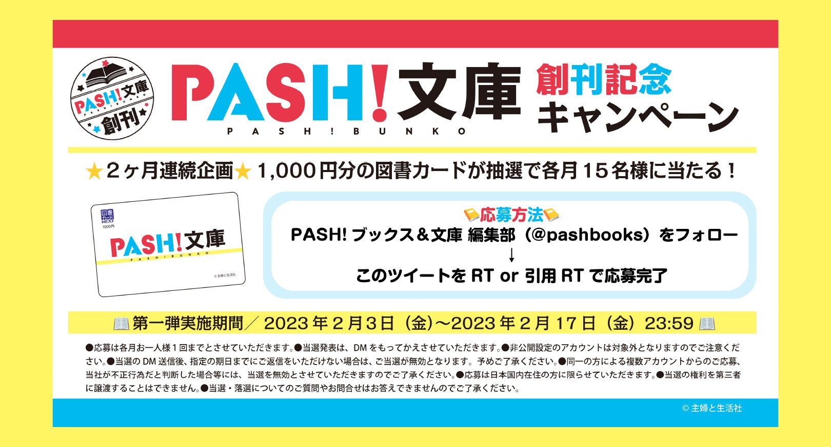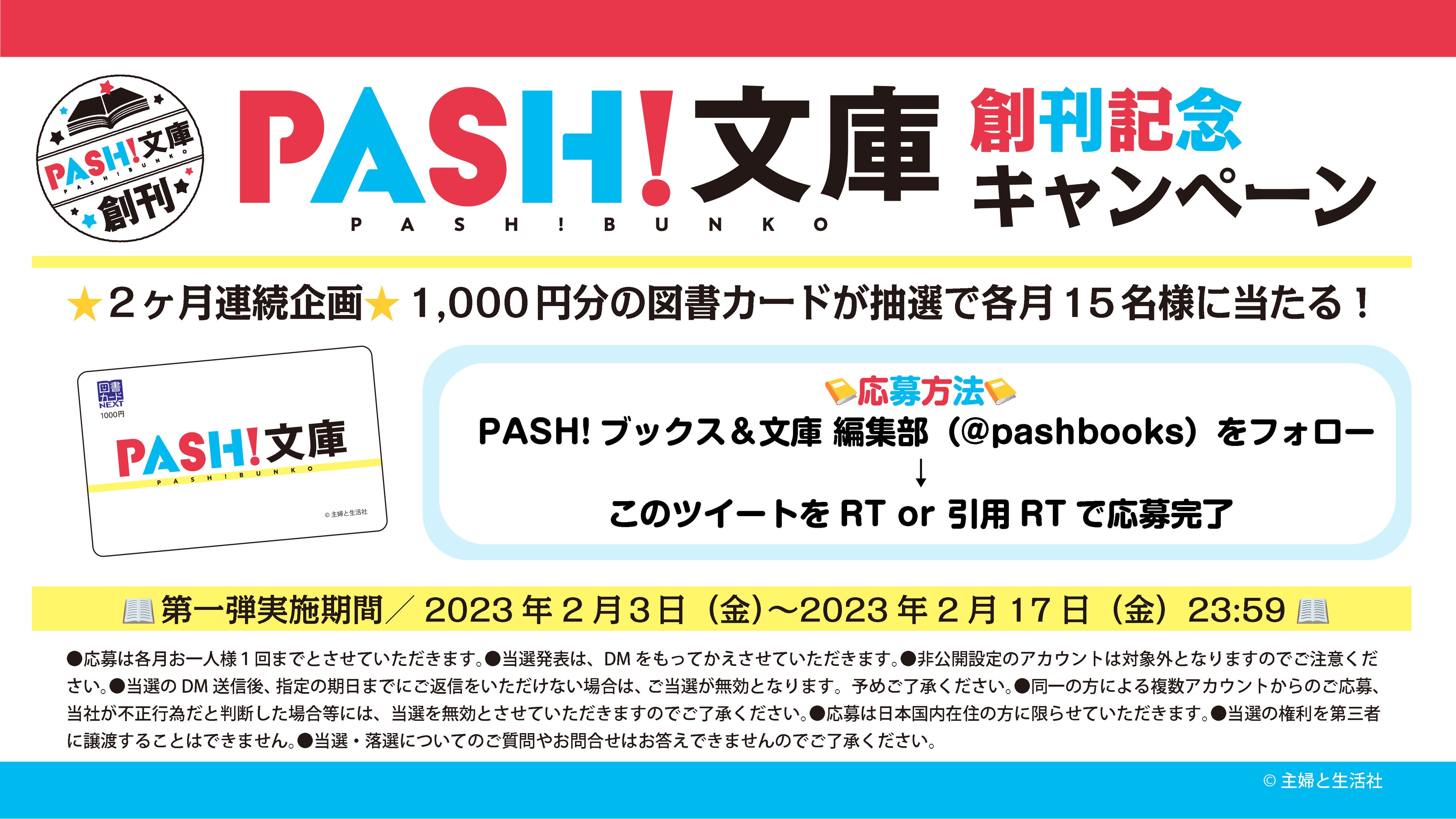 第1弾はPASH!ブックス&文庫編集部Twitterアカウント(@pashbooks)https://twitter.com/pashbooksをフォローして、キャンペーンツイートをリツイートをするだけで抽選で1000円分の図書カードNEXTが当たるフォロー&リツイートキャンペーン。創刊を記念した「PASH!文庫」オリジナルデザインの図書カードにも注目です。