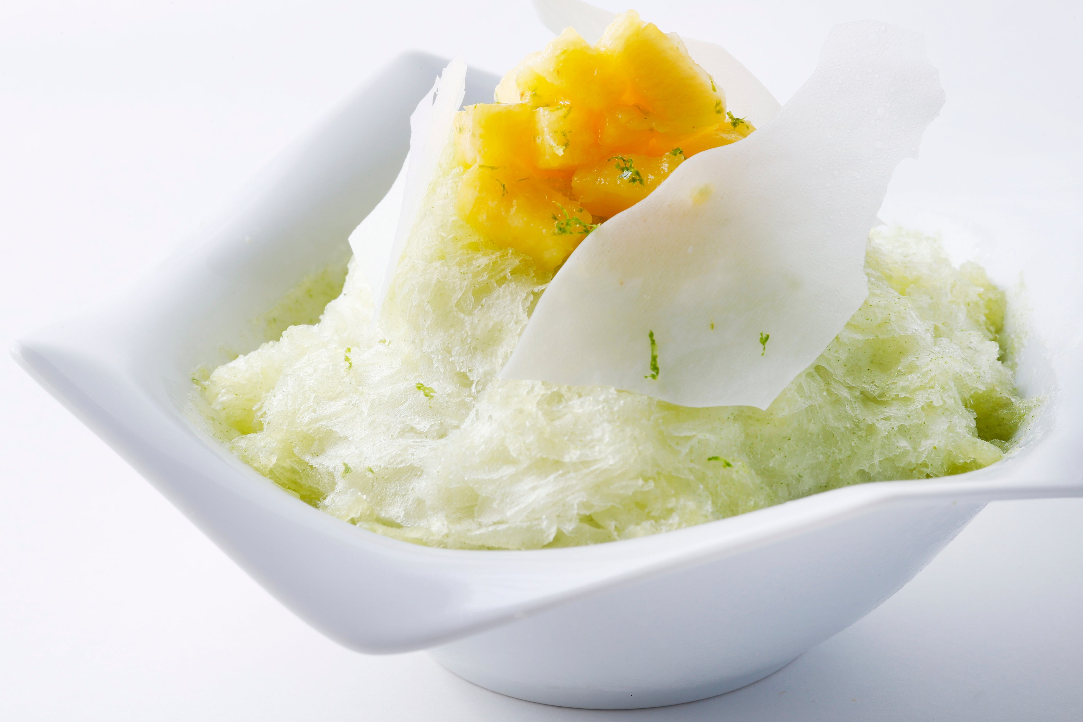 エンポリオ アルマーニ カフェのかき氷は、シロップをかけるスタイルではなく氷自体にしっかりとテイストをつけたスタイル。エストラゴンはハーブビネガーに使用されることでも知られ、ヨーロッパでは定番ハーブの1つとして広く愛されています。今年のかき氷は、氷自体にエストラゴンとライムの味わいを付け、氷を口に含んだ瞬間にさわやかな酸味と豊かな香りが口の中に広がるように計算しました。トップ部分にはライムでマリネしたパイナップルをダイス状にカットしたものとココナッツチップをトッピング。