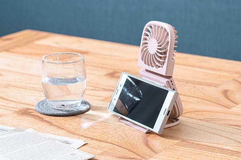 モバイルバッテリー機能付でマルチに活躍するハンズフリーファン。スマホを置きながら涼めるなど、便利な機能を1台に搭載。