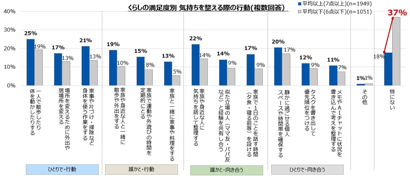 普段、気持ちを整えるためにどのような行動を行っているかを尋ねたところ、くらしの満足度が平均点以下(6点以下)の層では、37%が「気持ちを整える行動を特にしていない」 と回答しました。この結果から、気持ちを整えるための手段や行動を持てていない人が、比較的多い状況が明らかになりました。