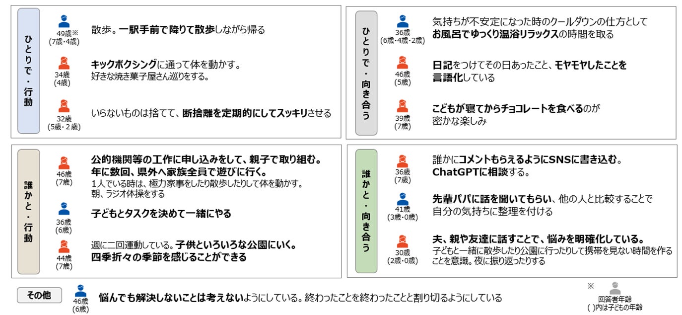 また、自由回答からも、「ひとりの時間の確保をする」「子どもと一緒に取り組む」「日記など自分の中で整える」「甘いものなどの嗜好品で気分を切り替える」「誰かに話して整理をする」など、気持ちの整え方は人によって異なり、幅のある行動が選ばれていることが見て取れました。