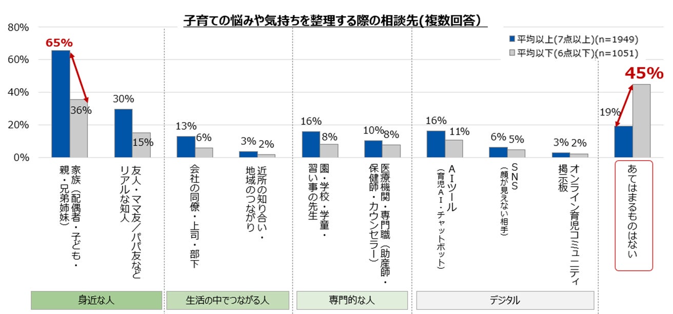 また、「生成AI」を相談先とする人は、満足度が7点以上の層で16%、6点以下の層でも11%と一定数存在しており、園・学校・学童・習い事の先生や、医療・専門機関への相談と同程度となっています。自由回答でも、「人に聞くほどではないことの整理に役立つ」「時間を気にせずやり取りできる」「相手の感情を気にせず話せる」といった声が寄せられ、気持ちの整理をする際の相談先の一つとして、 “AIも選択肢に加わりつつある実態”が見えてきました。
