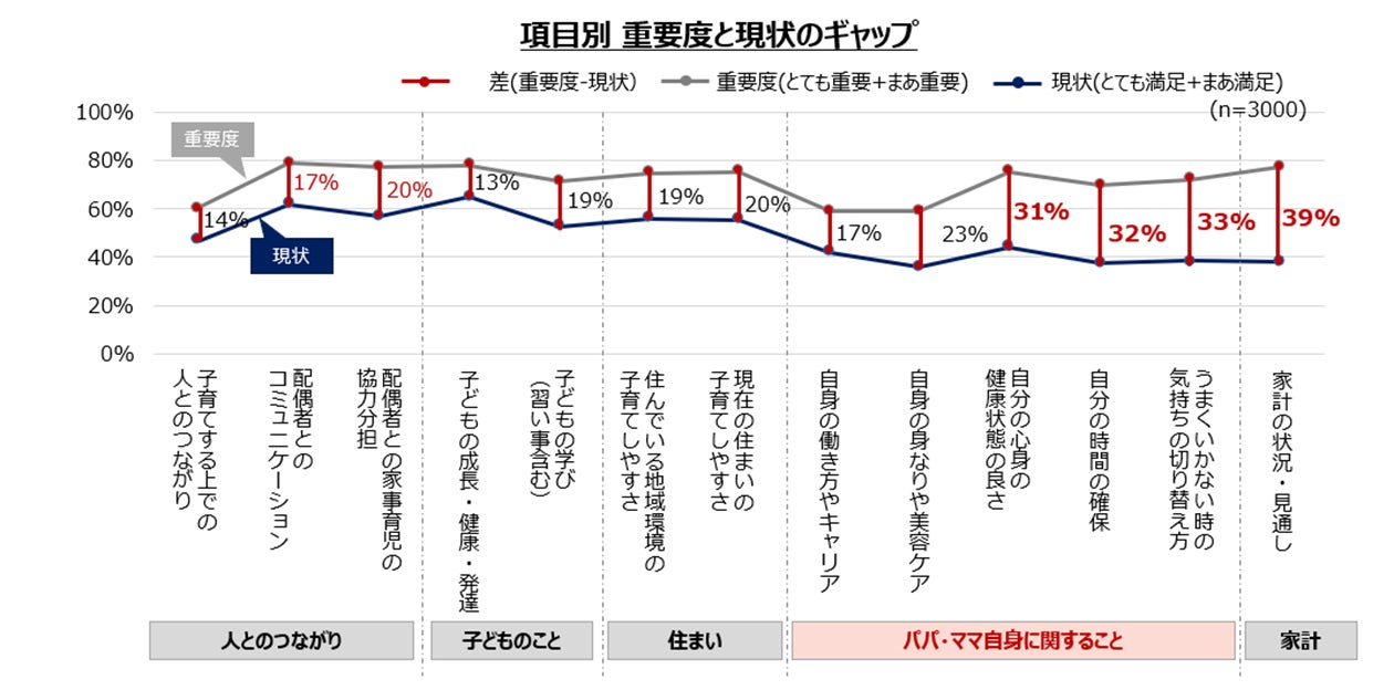 くらしの中で「重要と感じていること」とその「現状の実現度(満足度)」を比較したところ、最もギャップが大きかったのは「家計の状況・見通し」で39%となりました。これに続き、「気持ちの切り替え方(33%)」、「自分の時間の確保(32%)」、「自分の心身の健康状態の良さ(31%)」といった子育て中のパパ・ママ自身の余裕やコンディションに関わる項目でギャップが大きい結果となりました。