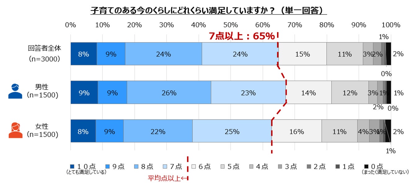 子育て中のくらしの満足度は10点満点中平均6.9点。約3人に2人(65%)が7点以上と回答