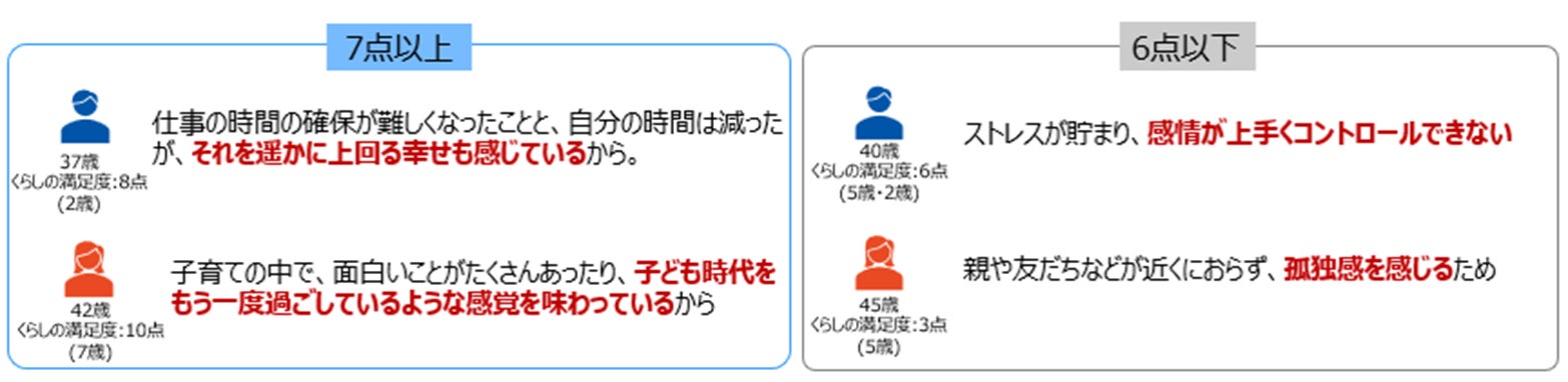 子育てのある現在のくらしにどのくらい満足しているかを10点満点で尋ねたところ、7点以上と回答した人は65%と約3人に2人を占めました。満足度の平均点は6.9点となっています。性別でみると、7点以上と回答した割合は男性が67%、女性は64%となり、男性の方がやや高い傾向が見られたものの、大きな差は見られませんでした。満足度についての理由を尋ねたところ、7点以上と回答した人からは、「自分の時間は少なくなってもそれ以上に子どもとの時間や子どもの成長が幸せに感じている」「子どもがいることで親自身が経験できていることがある」といった声が寄せられました。