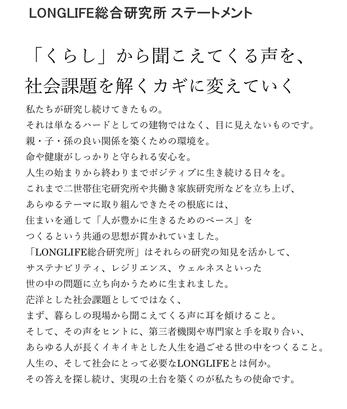 子育てを取り巻く環境が大きく変化する中で、親が日々のくらしをどのように整え、どのような支えを頼りに過ごしているのかを丁寧に捉えることは今後ますます重要なテーマです。LONGLIFE総合研究所では、今後もお客様の声に耳を傾けながら、子どもも親も、家族一人ひとりが無理なく自分たちらしく過ごせることを大切に、より良いくらし方や商品・サービスの提案に取り組んでまいります。