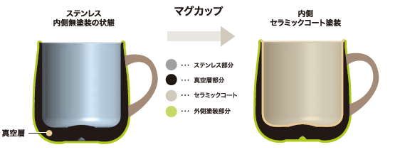 この度、ステンレス特有の「臭い」や「ざらざらとした口当たり」が苦手というお客様の声にお応えし、内側にセラミック塗装を施したセラミックマグを開発いたしました。ステンレス部分を塗装することで特有の臭いを軽減し、陶器のような口当たりの良さを実現。また、汚れがつきにくく、お手入れしやすくなりました。