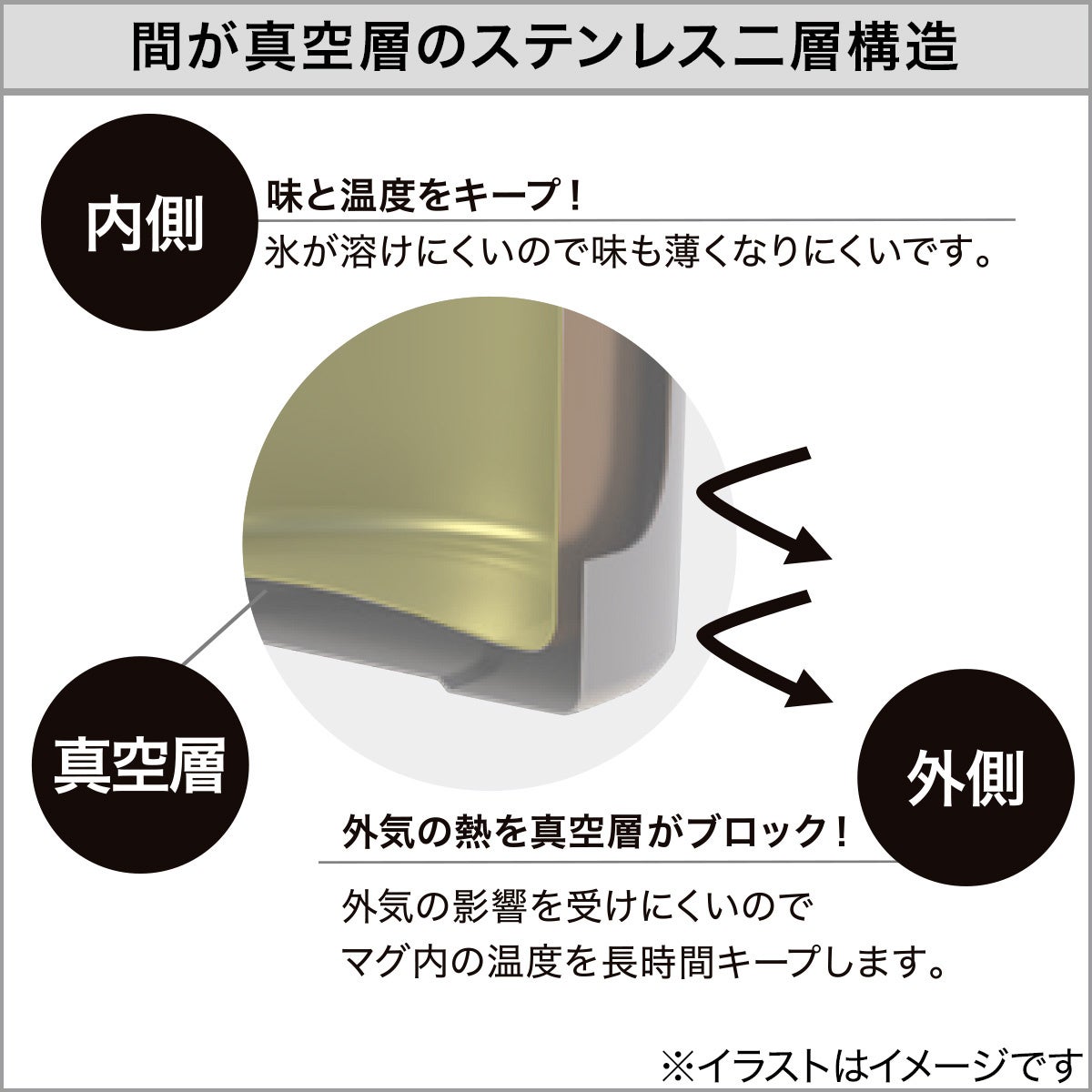 真空二層構造のステンレスマグは、ホットでもアイスでも飲み頃の味と温度をキープするため、美味しく飲み物が飲めると人気の商品です。