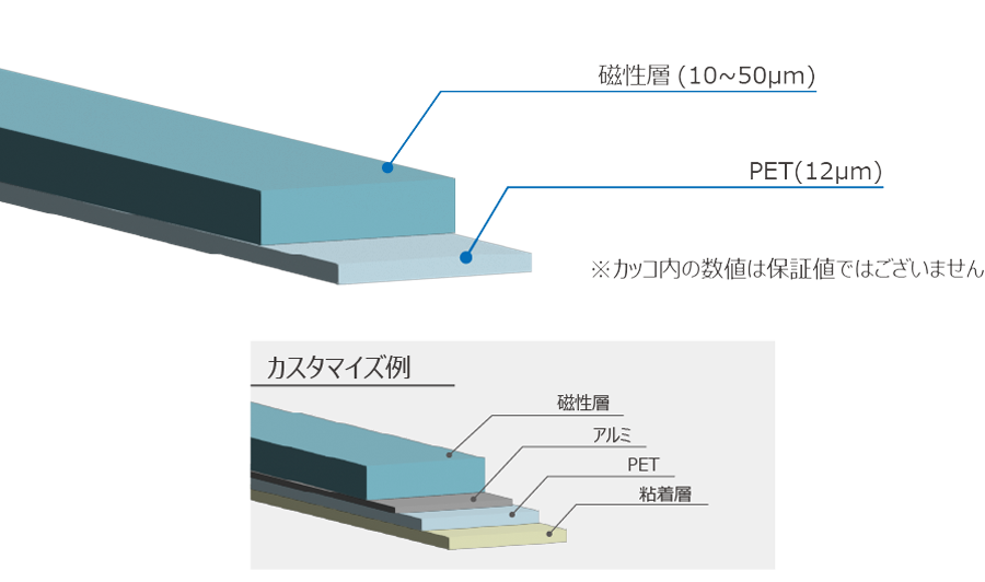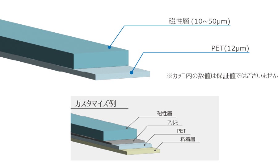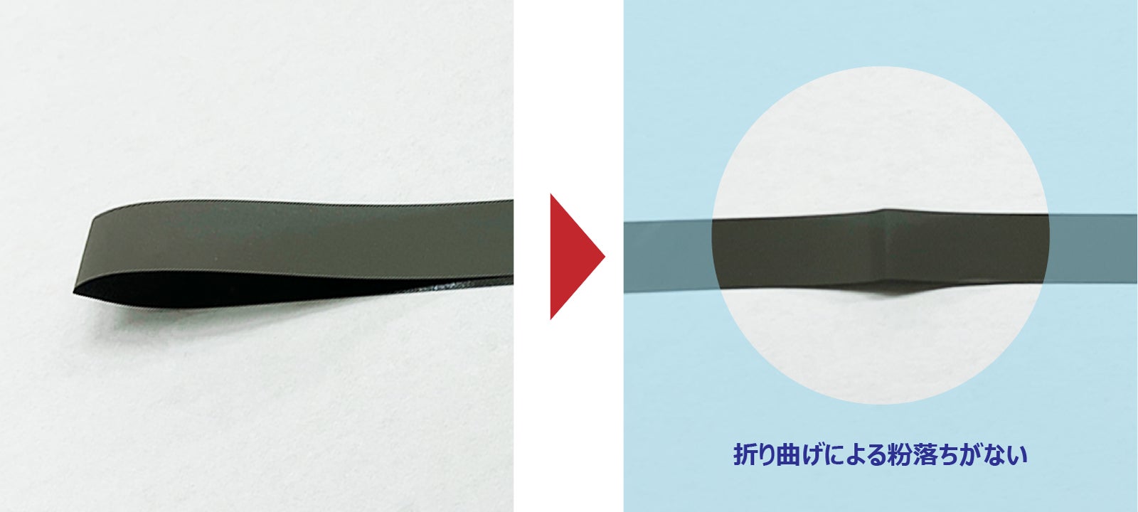 このたび出荷を開始するサンプルは、機能性評価用途向けに、周波数帯域や形状(シート状/テープ状)、幅・長さなどカスタマイズに対応します。「Mタイプ」は磁気ノイズ抑制と薄膜・軽量化を両立しており、折り曲げ時のクラックや粉落ちを低減した塗膜設計ならびにコーティング加工技術により、厚さ約60 マイクロメートルの薄さで直径1ミリメートルの曲げにも耐える屈曲性を有します。また、金属膜との複合化により電界シールド性能をさらに向上させることも可能です。