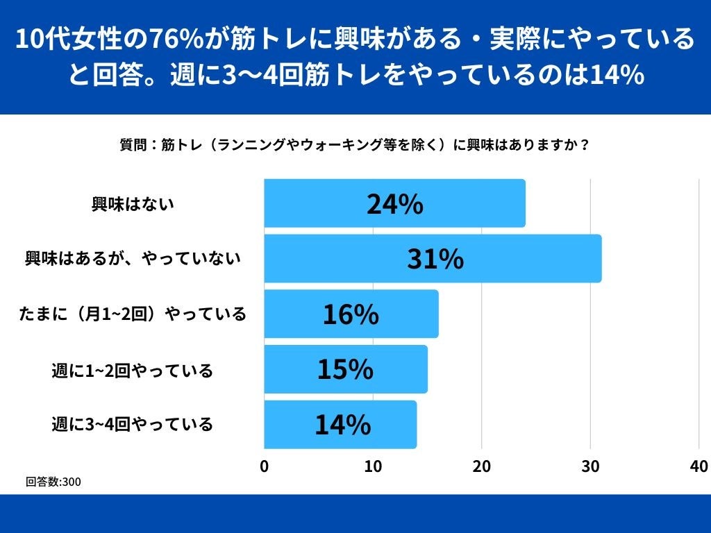 10代女性を対象とした「筋トレ(ランニングやウォーキング等を除く)に興味はありますか?」というアンケートで最も多かった回答は「興味はあるが、やっていない」で31%でした。