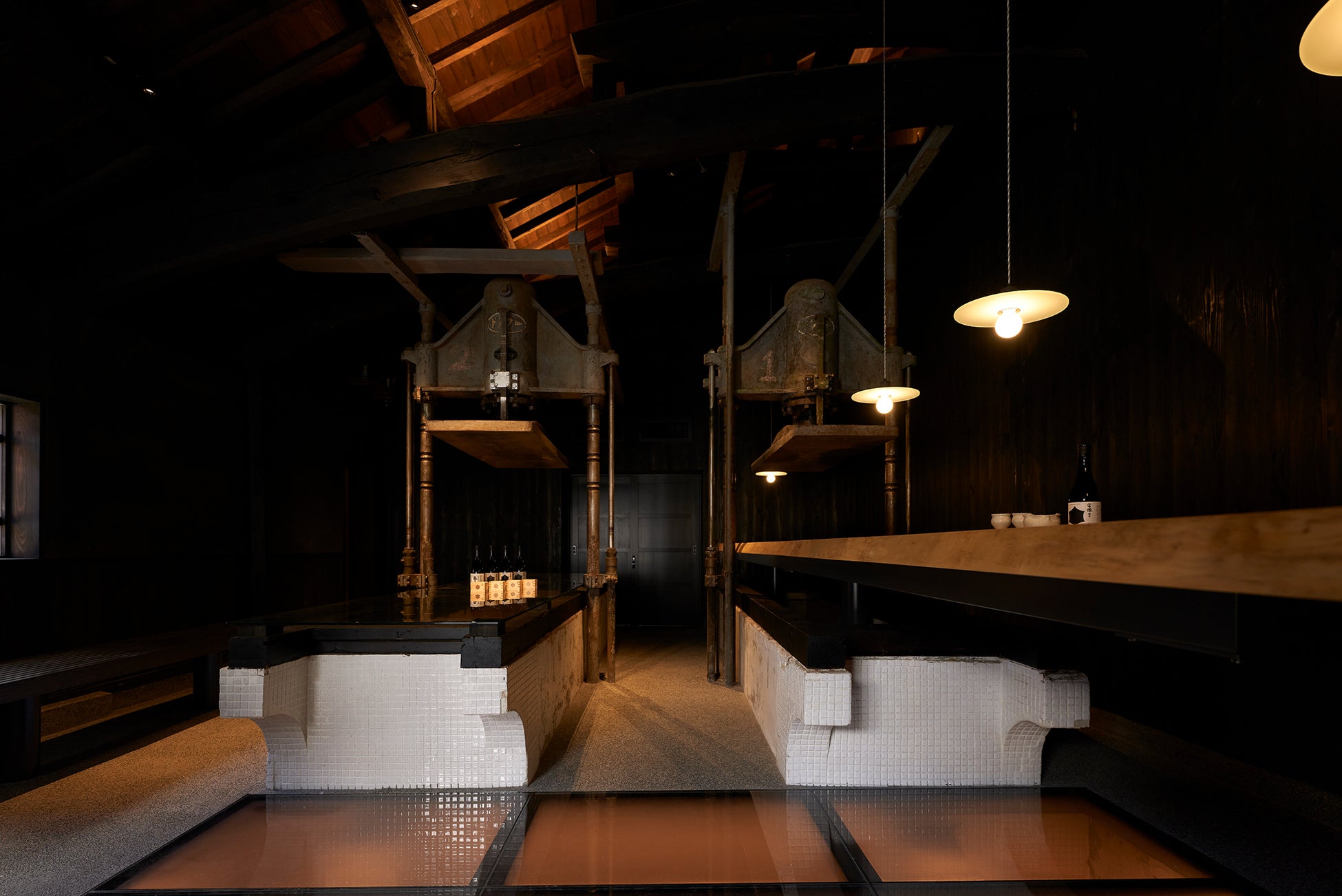 伝統的な槽搾り製法で用いた設備を再活用したスタンディングバーです。古き良き酒蔵の趣を残す梁や建具を眺める上質な空間で、日本酒と酒肴とのペアリングを楽しめる有料試飲スペースとして活用してまいります。
