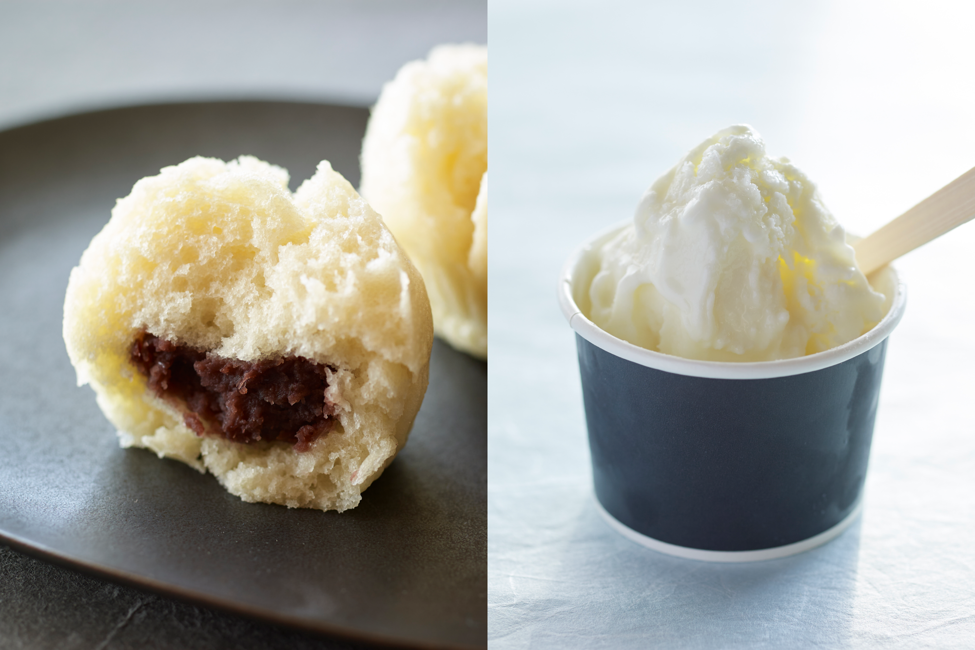 酒造りの過程でできる酒粕を使った「宗像 花酒(はなさか)まんじゅう」や、宗像の素材を使ったジェラートなどをテイクアウトでご用意しています。