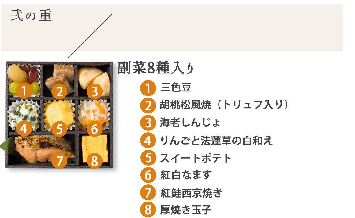 *弐の重:ご高齢者さまの好みに合った色とりどりのメニューをワンランク上に仕立てた副菜8種入り。