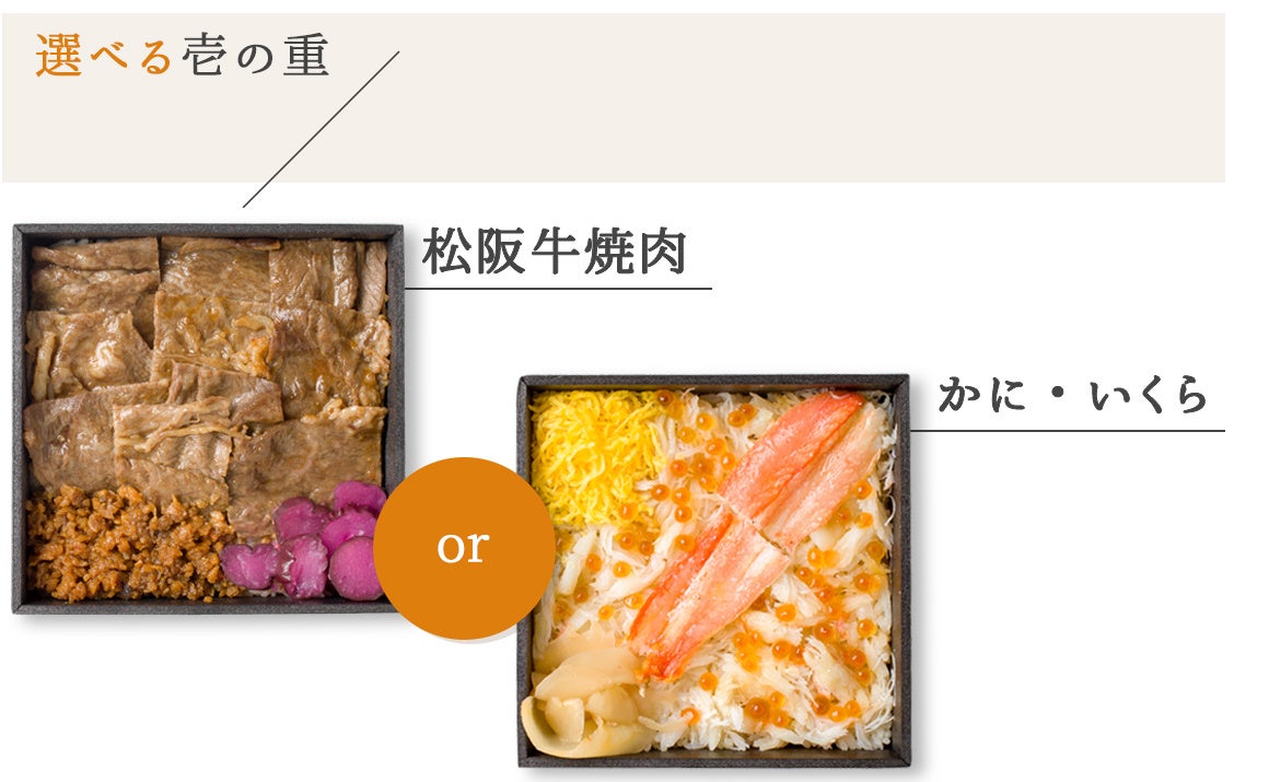 *壱の重:豪華メイン。「松阪牛焼肉弁当」と「かに・いくら弁当」2種よりお好みをご選択可能です。