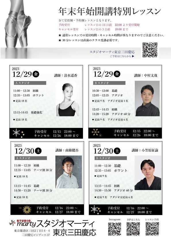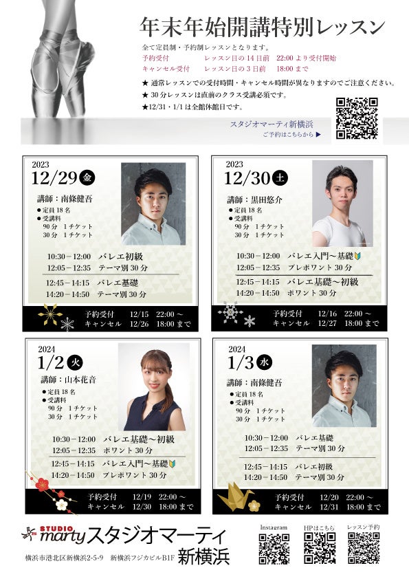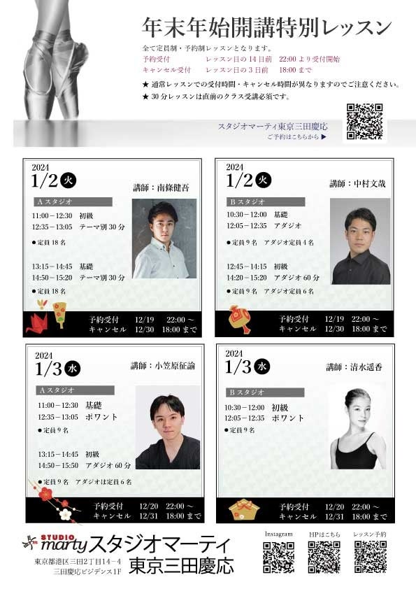 バレエを愛する皆様にレッスンする場所をお届けし、充実したダンスライフを提供するスタジオマーティでは、年末年始もレッスンする場を設けるべく、『年末年始の特別レッスン』を開講することとなりました。開催スタジオは、新横浜スタジオ・三田慶応スタジオの2校となります。年末年始もスタジオマーティでバレエを楽しみませんか?