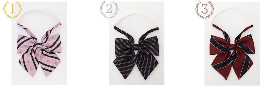 ブレザーは、合わせやすいネイビー、グレーといったカラーが男女問わず人気でした。スカートは、全体的に落ち着きのある色味が人気の傾向ですが、推しやキャラクターを意識したコーデでは色物が選ばれています。スラックスは、スカートとおそろいができる柄が上位3位までを占めました。ニットはエンジが圧倒的人気です。ネクタイは差し色に明るい色味が多く選ばれています。リボンは、ピンクが一番人気でした。かわいい制服コーデにピンクのリボンがポイント使いに活用されました。