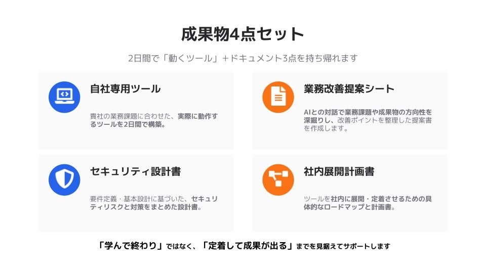 2日間で「動くツール」をその場で即実装 「学んで終わり」にせず、参加企業の個別の業務課題に合わせた実用的なツールを2日間で構築します。あわせて、セキュリティ設計書や社内展開計画書などの成果物4点(自社専用ツール/業務改善提案シート/セキュリティ設計書/社内展開計画書)を持ち帰ることで、翌日から即運用が可能です 。