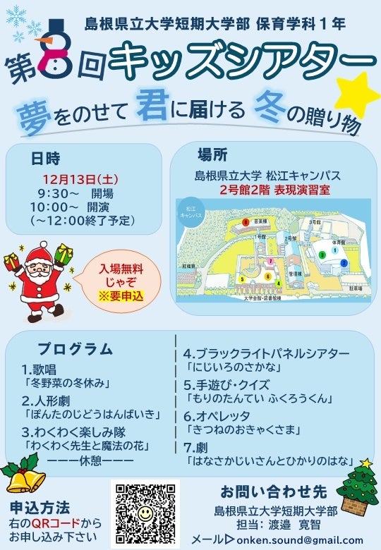 島根県立大学短期大学部保育学科では、12月13日(土)に第8回キッズシアターを開催します。