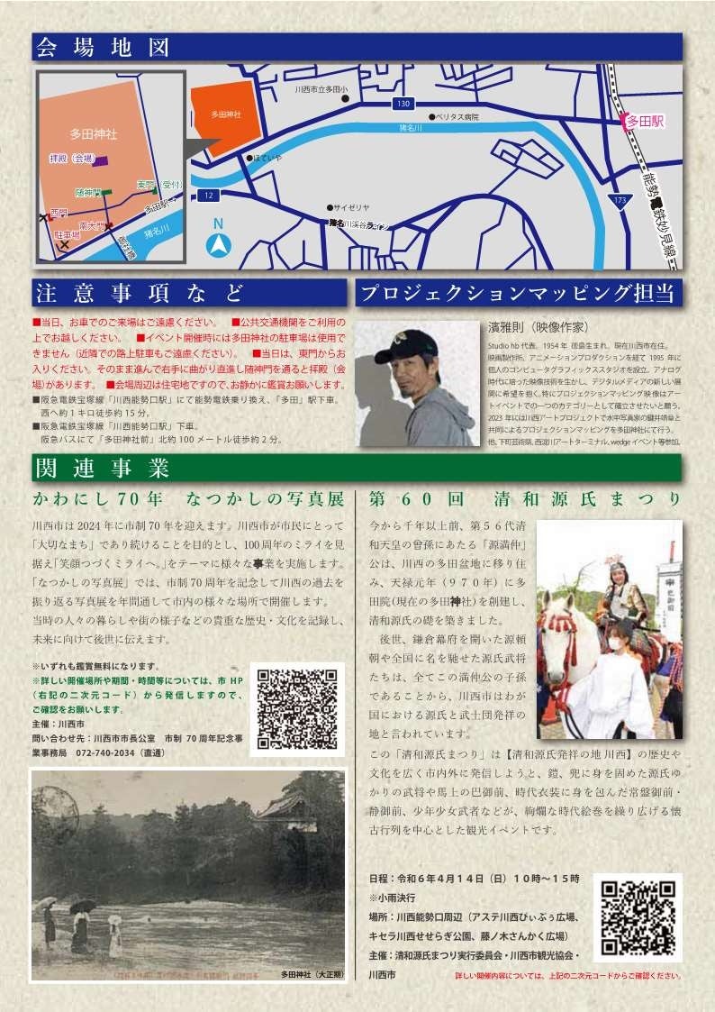 清和源氏発祥の地である兵庫県川西市の多田神社の拝殿で2日間限定の「清和源氏発祥の地 川西 時代絵巻編」(主催:川西市観光協会)をプロジェクションマッピングで公開。