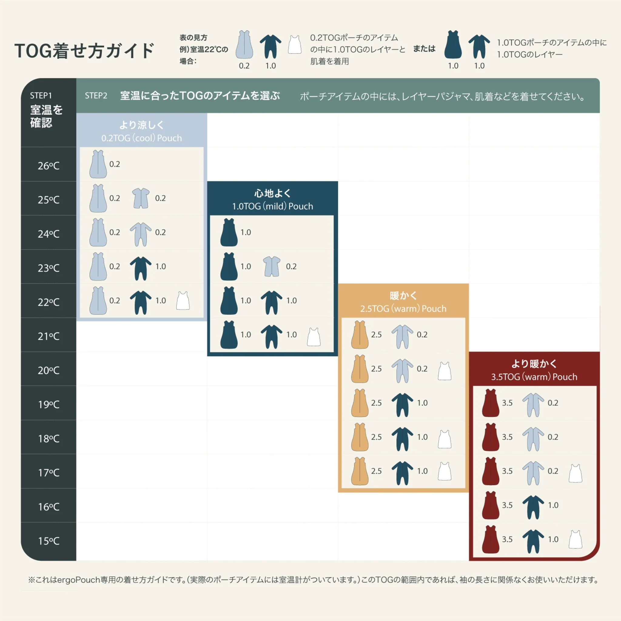 1.0 TOG レイヤーは、ポーチの下にもう1枚必要な涼しい夜に最適です。保護者の方は、ポーチに付属している室温計付き着せ方ガイド*に従って、 どんな室温でもお子さまに最適なアンダーレイヤーを見つけることができます。