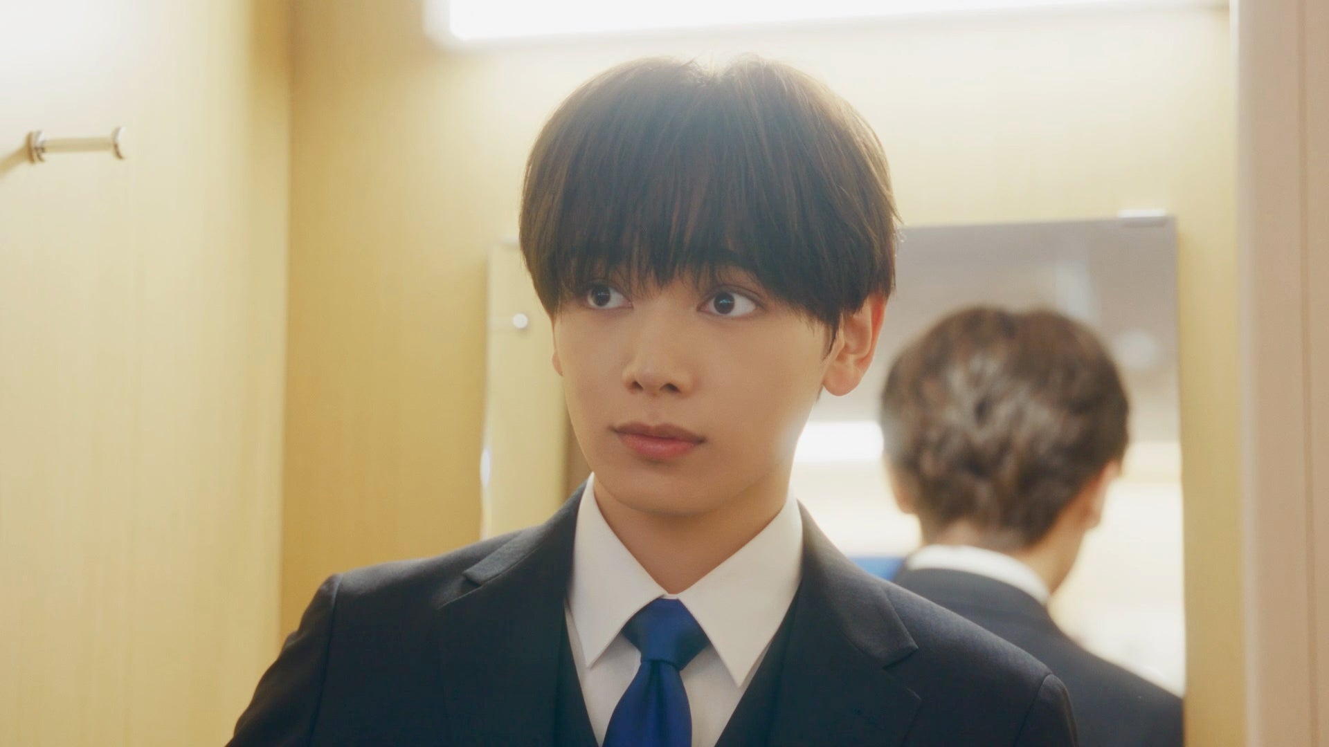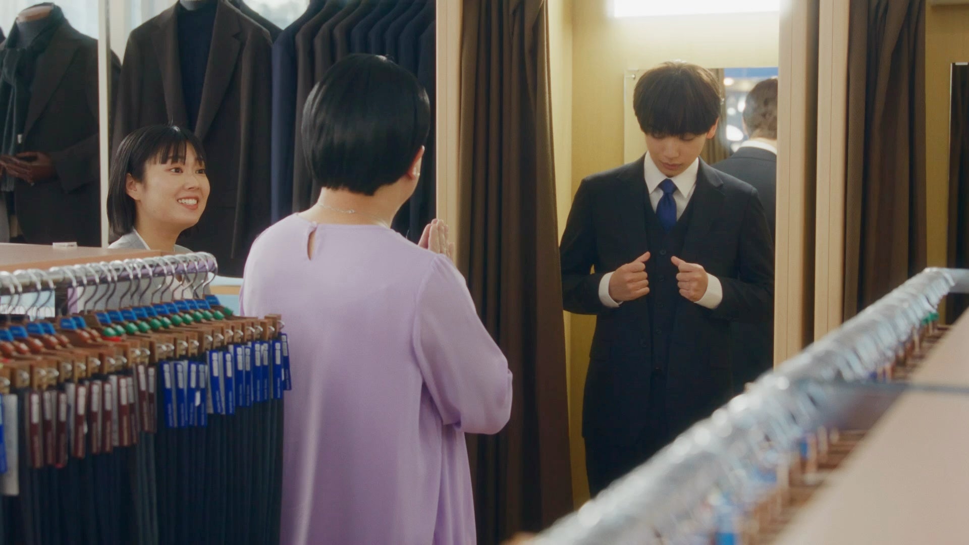 CMを引き立てる長田さんの歌唱力に注目 爽やかにスーツを着こなす息子役として宮世琉弥さん、母親役として松尾駿さんが共演