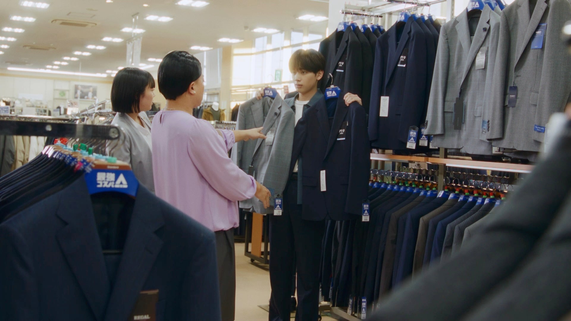 今回のCMでは、お笑い芸人の中でも屈指の歌唱力を持つとされるチョコレートプラネット長田さんが「洋服の青山」フレッシャーズ応援ソング『大丈夫』を熱唱します。アーティスト顔負けの長田さんの歌に合わせて、母親役の松尾さんと息子役の宮世さんが大学入学用のスーツを購入しに初めて「洋服の青山」に来店する内容となっています。