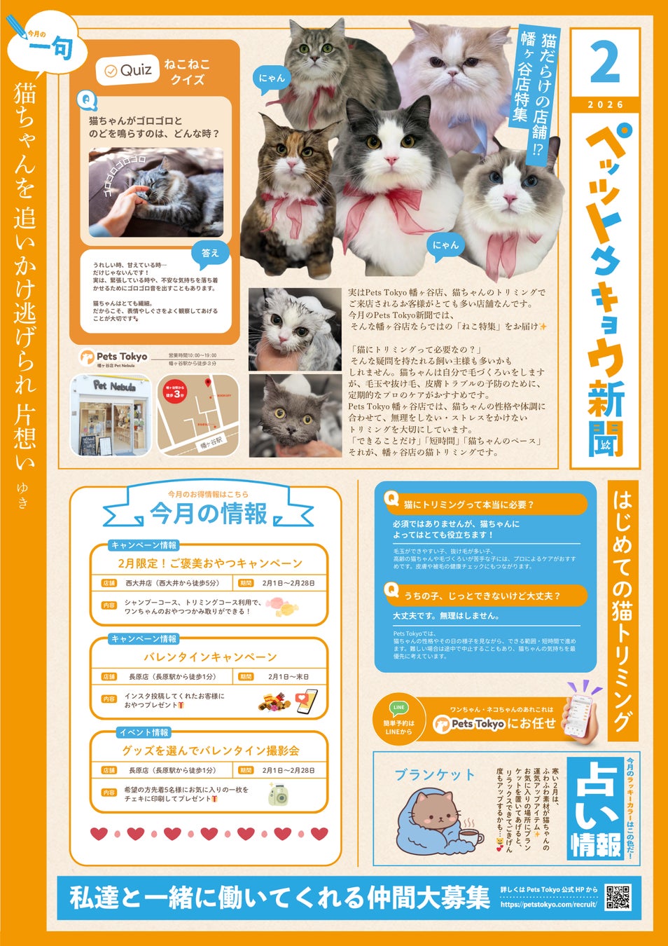 Pets Tokyo株式会社(本社:東京都千代田区、代表取締役:Raymond Chen)は、ペットとの毎日を豊かにする情報をお届けするフリーペーパー「ペッツトウキョウ新聞」2月号を発行いたしました。