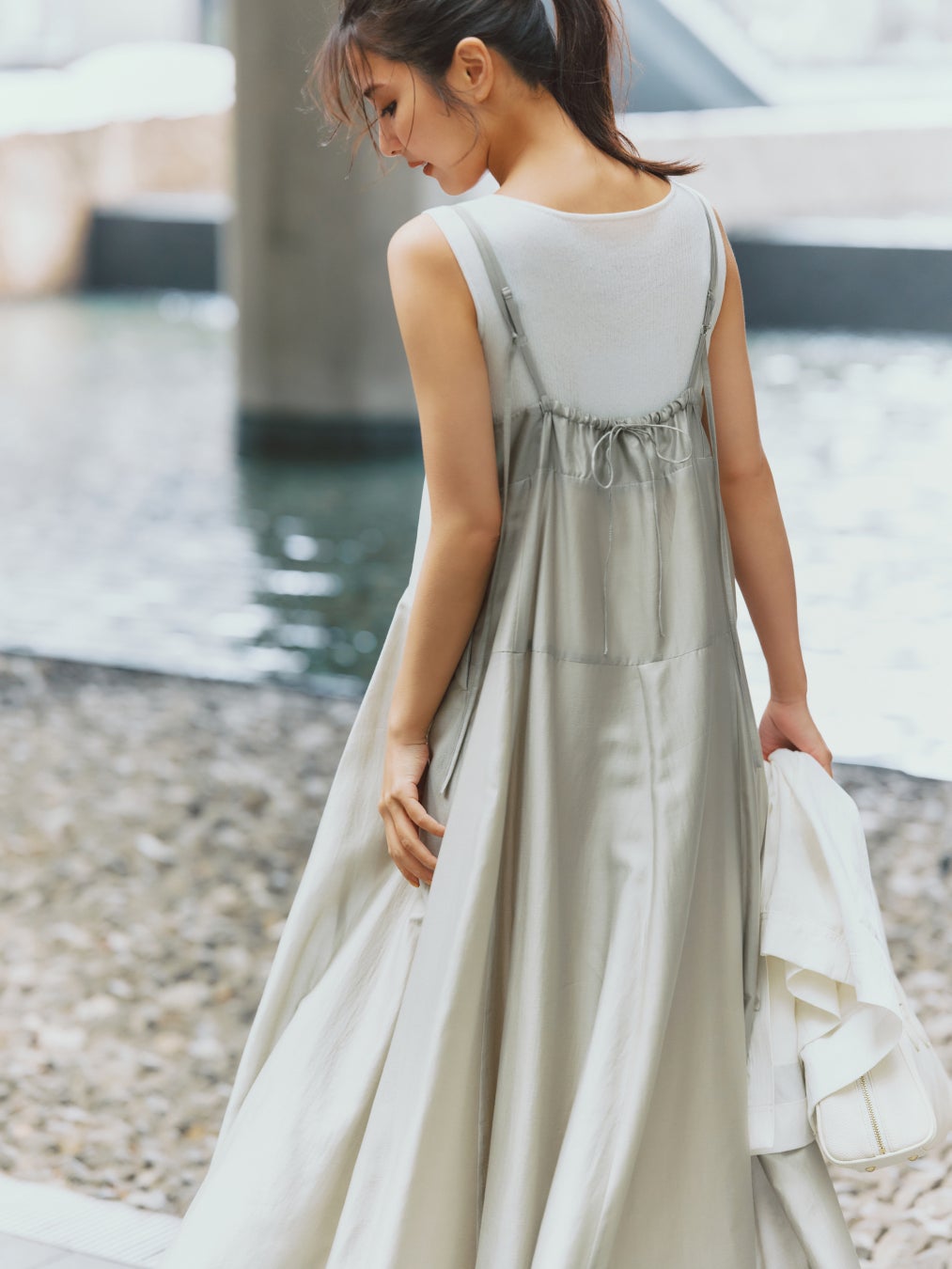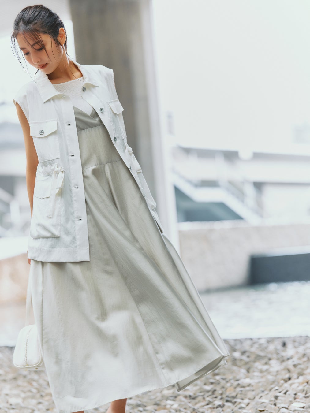 柔らかでノーブルな気品溢れるフレアドレスとラフなジレが好相性