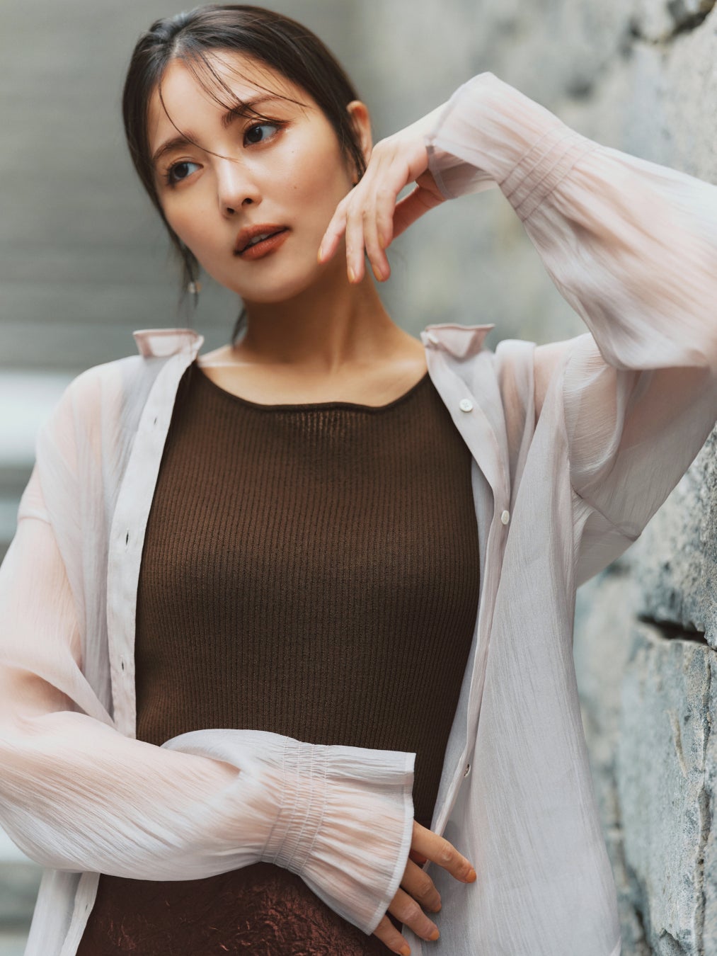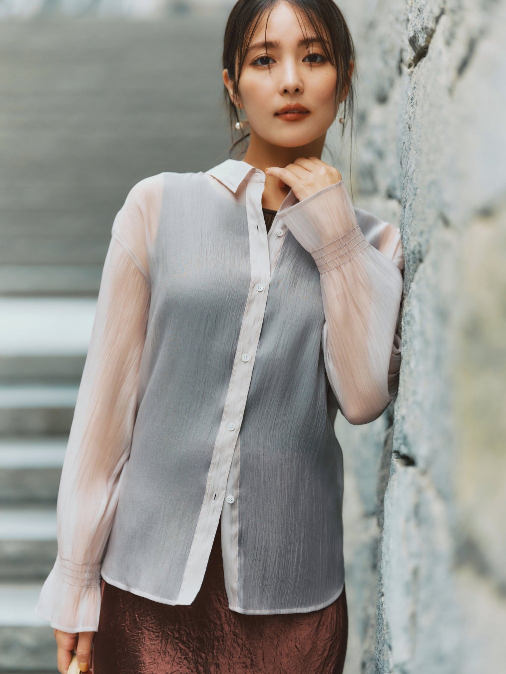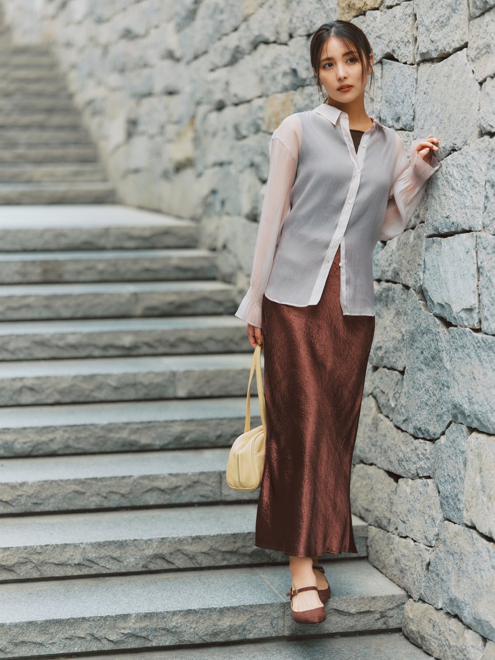 レディな色調のコーディネートをシアーとサテン素材でマチュアなムードに
