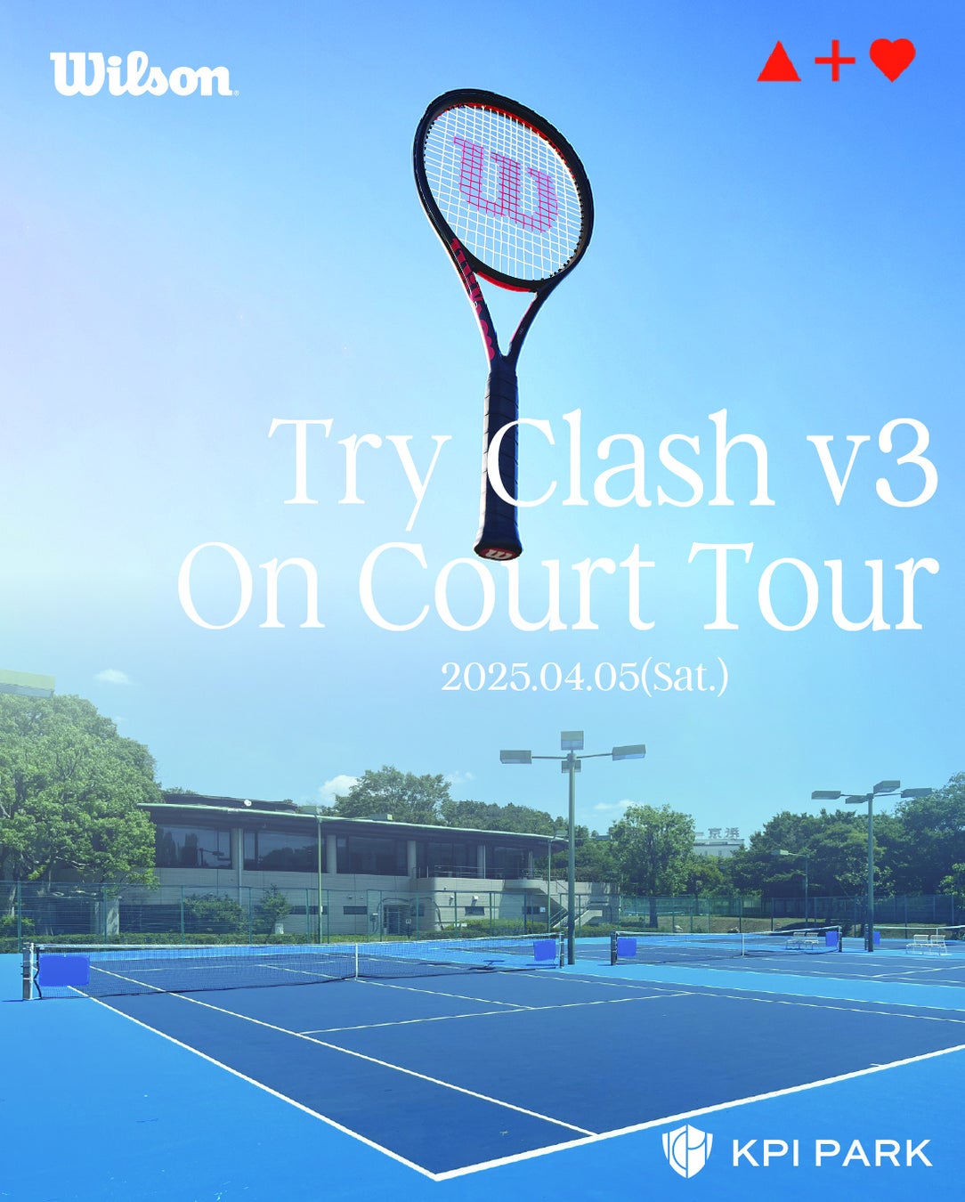 KPI株式会社(本社:東京都渋谷区、代表取締役CEO:薮田 恵士)は、2025年4月5日、横浜市戸塚区のスポーツ施設KPI PARK(神奈川県横浜市戸塚区信濃町)にてWilson新製品ラケット「Clash V3」シリーズの試打会イベント「Try Clash V3 On Court Tour Final Wilson @KPIPARK」を開催します。