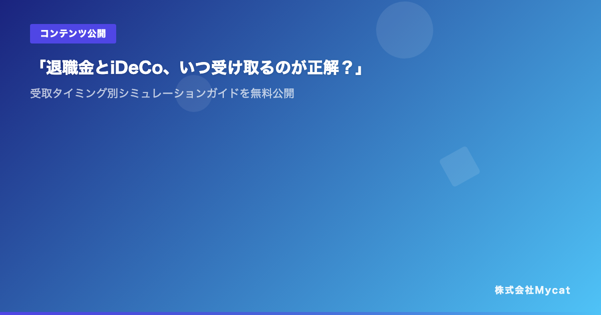 株式会社Mycat(本社:東京都目黒区)は、退職金とiDeCoの受取タイミングに焦点を当てたシミュレーションガイドを「退職金・iDeCo受取最適化シミュレーター」(https://taisyoku.xyz)上で無料公開しました。