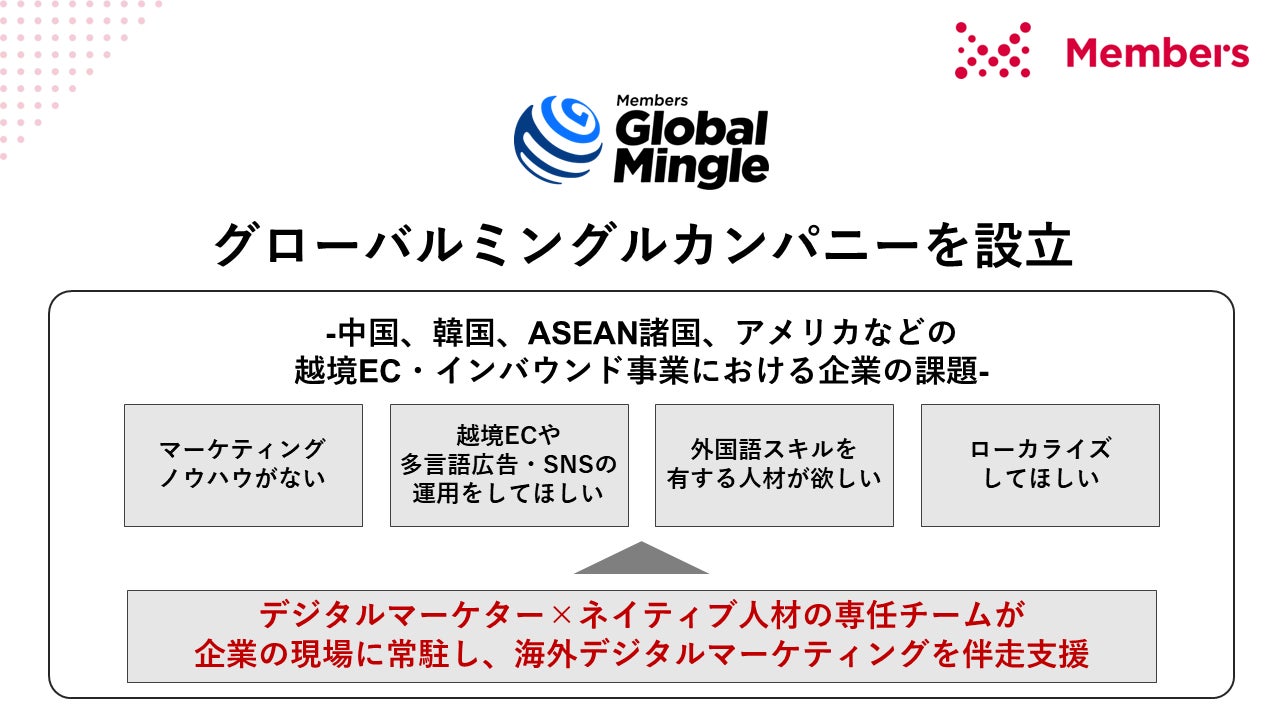 デジタルビジネス運用支援で企業の脱炭素DXを推進する株式会社メンバーズ(本社:東京都中央区、代表取締役社長:髙野 明彦、東証プライム:2130、以下「メンバーズ」)は、越境ECとインバウンド事業に特化し企業の海外デジタルマーケティングを支援する専門組織「グローバルミングルカンパニー」を2024年4月に設立し、営業を開始しました。