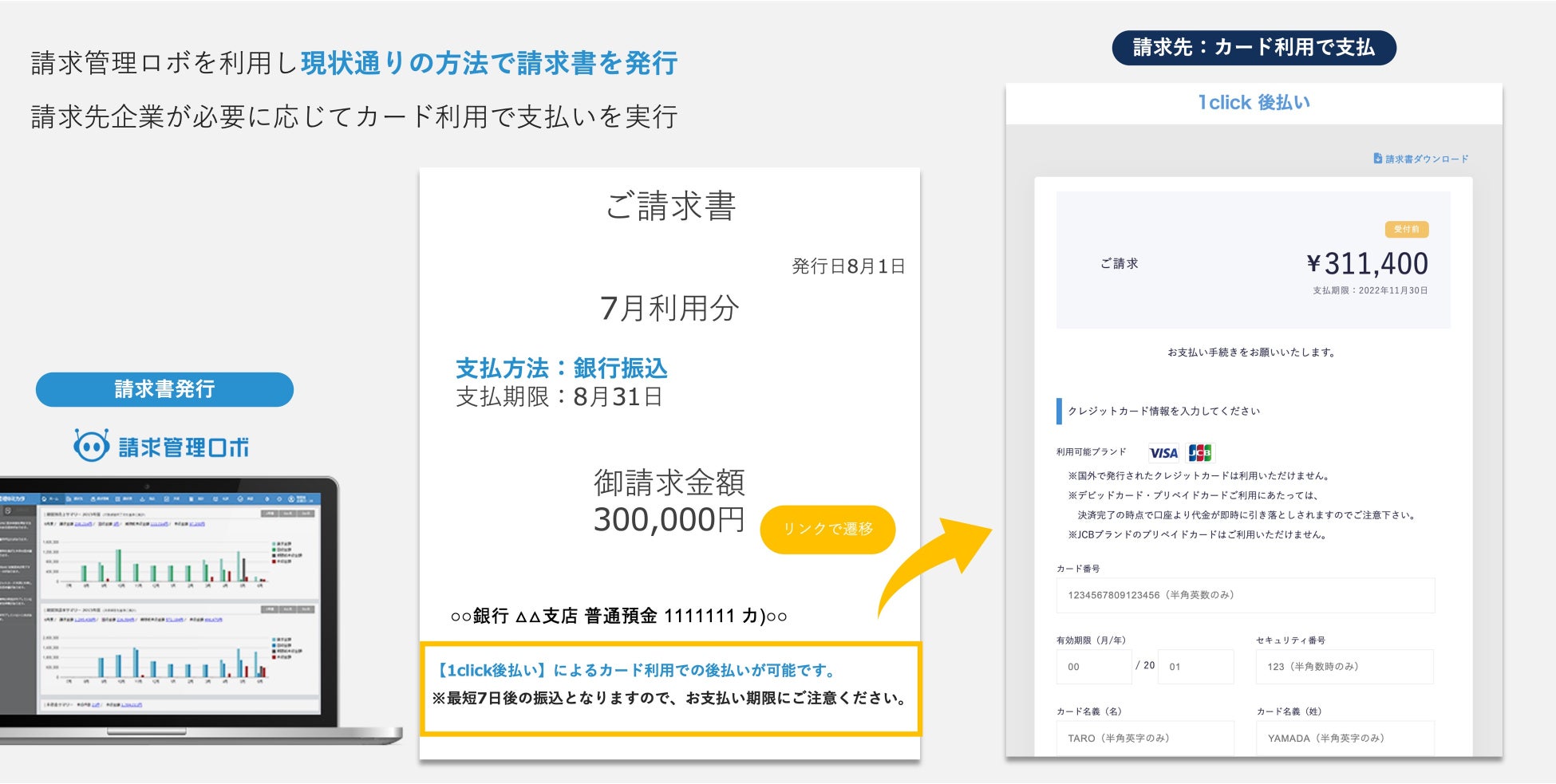 株式会社ROBOT PAYMENT(本社:東京都渋谷区、代表取締役:清久 健也、以下当社)は、請求・債権管理クラウド「請求管理ロボ」の利用企業における請求先に対して、請求書のカード決済を可能にする「1click後払い」の提供を開始したことをお知らせいたします。今回は、請求管理ロボから発行される請求書を対象として先行してサービス提供を開始し、今後はすべての請求書に対応予定です。